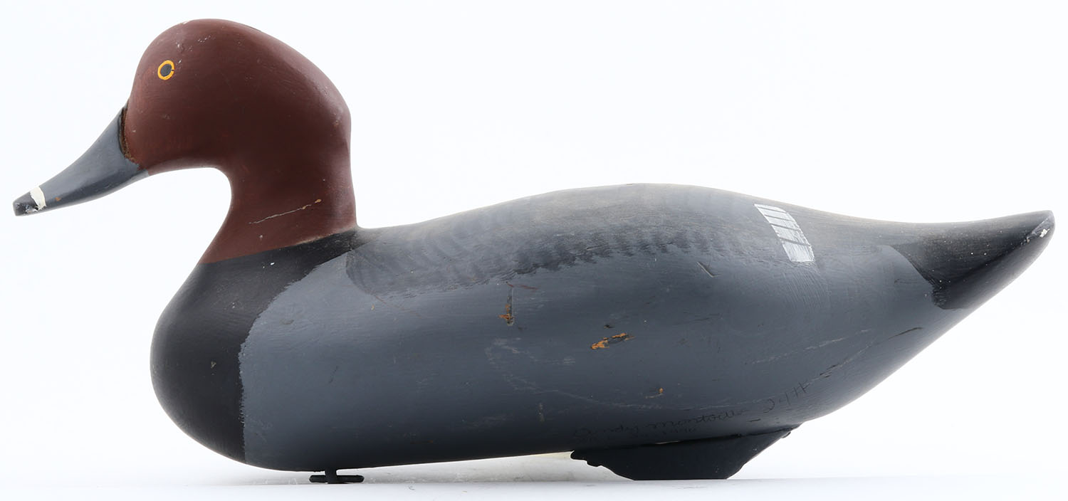 Redhead Drake Andy Mont???, MD carver, painted eyes, solid wood, original paint, structurally excellent, signed on bottom, 16'' OAL. Grade: Excellent - Value: 40 to 80