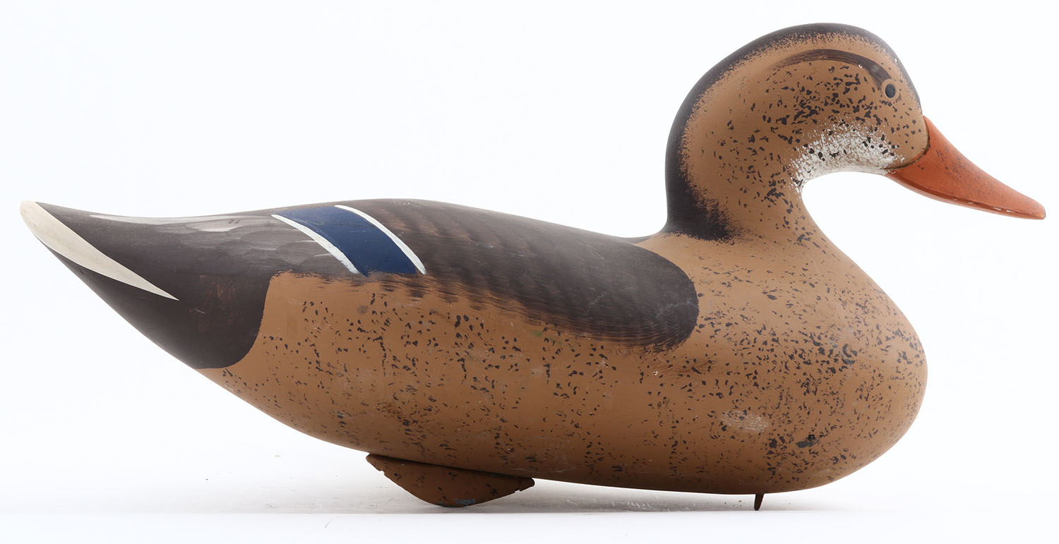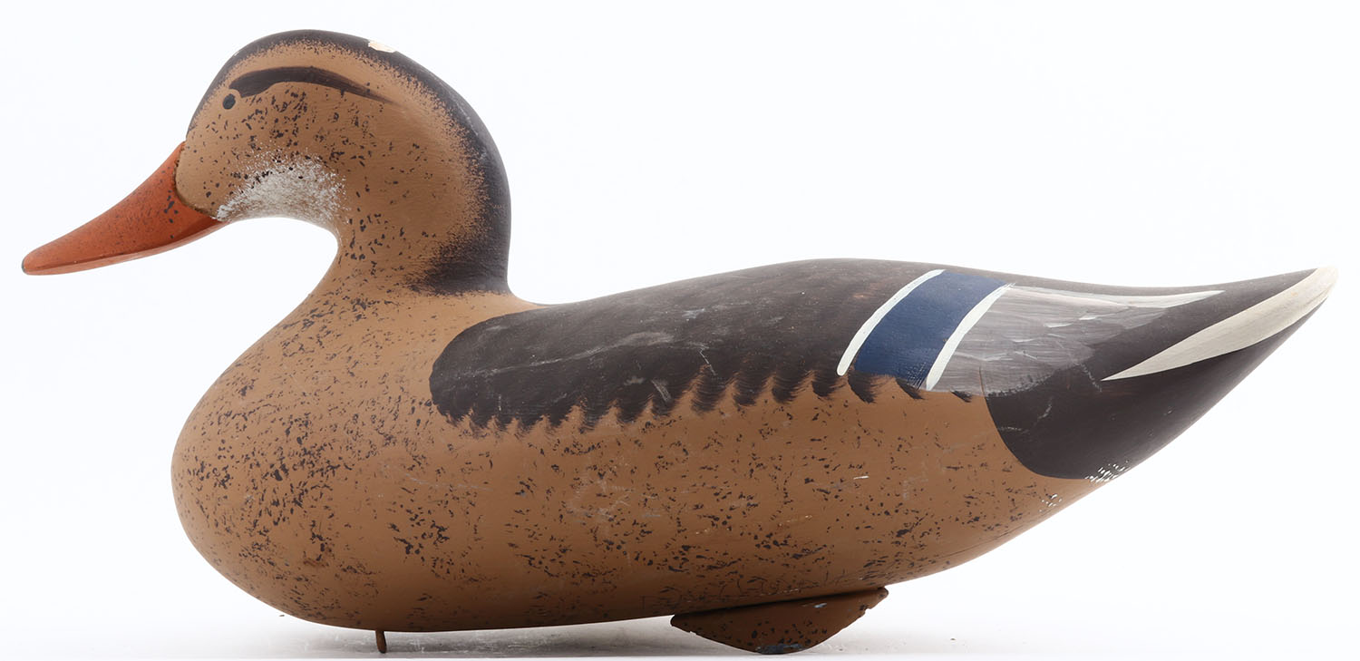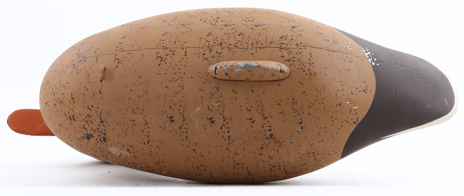 Mallard Hen by David Walker?, MD, painted eyes, hollow wood, original paint, structurally excellent, signed on bottom , 16''. Grade: Excellent - Value: 40 to 80