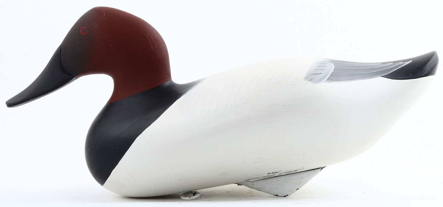 Canvasback Drake by Patrick ''Pat'' Vincent, Churchville, MD, painted eyes, solid wood, original paint, structurally excellent, signed on bottom, 16'' OAL. Grade: Excellent ++ - Value: 50 to 100