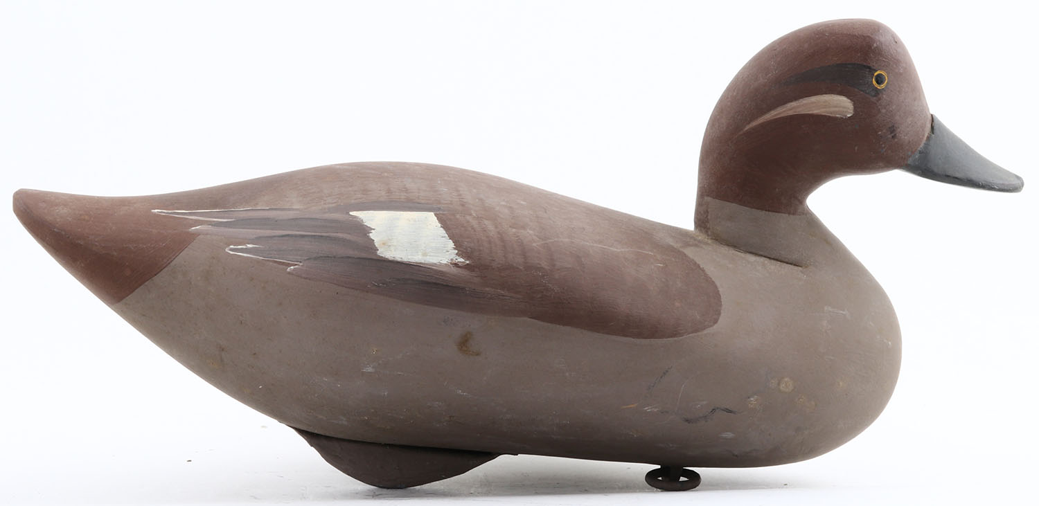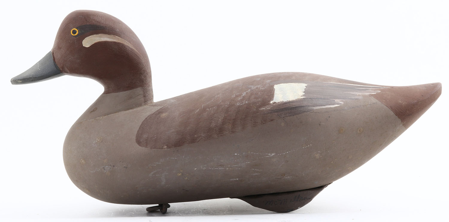 Bluebill Hen by McMillian?? MD, painted eyes, solid wood, original paint, structurally excellent, signed on bottom, 14'' OAL. Grade: Excellent + - Value: 40 to 80