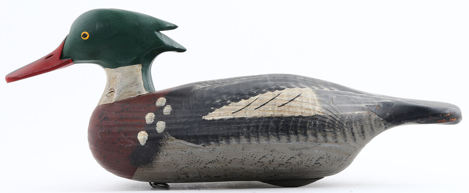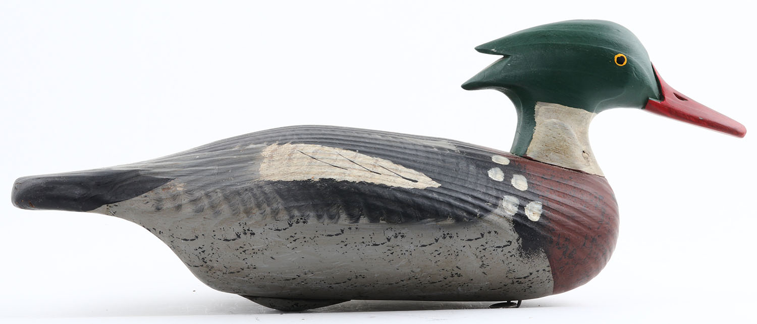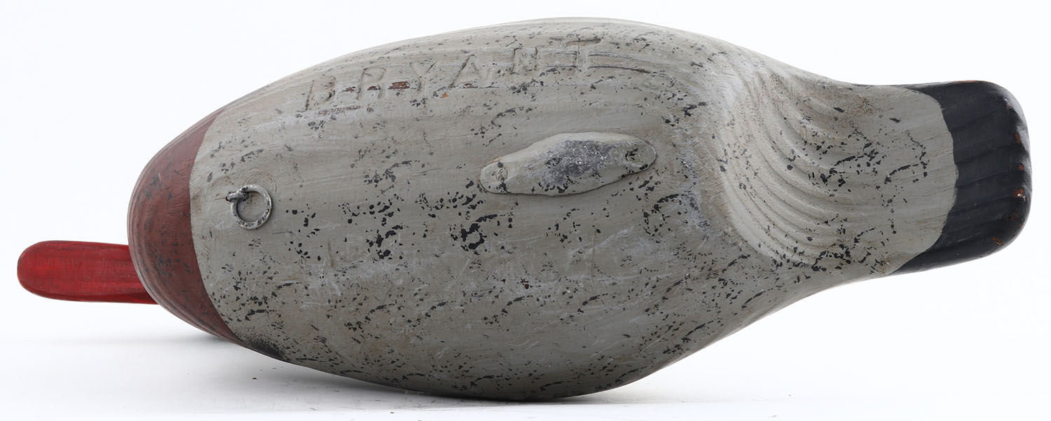 Red Breasted Merganser Drake by Capt. Vernon Bryant, Perryville, MD, painted eyes, solid wood, original paint, structurally excellent, branded BRYANT on bottom, 18'' OAL. Grade: Excellent + - Value: 40 to 100