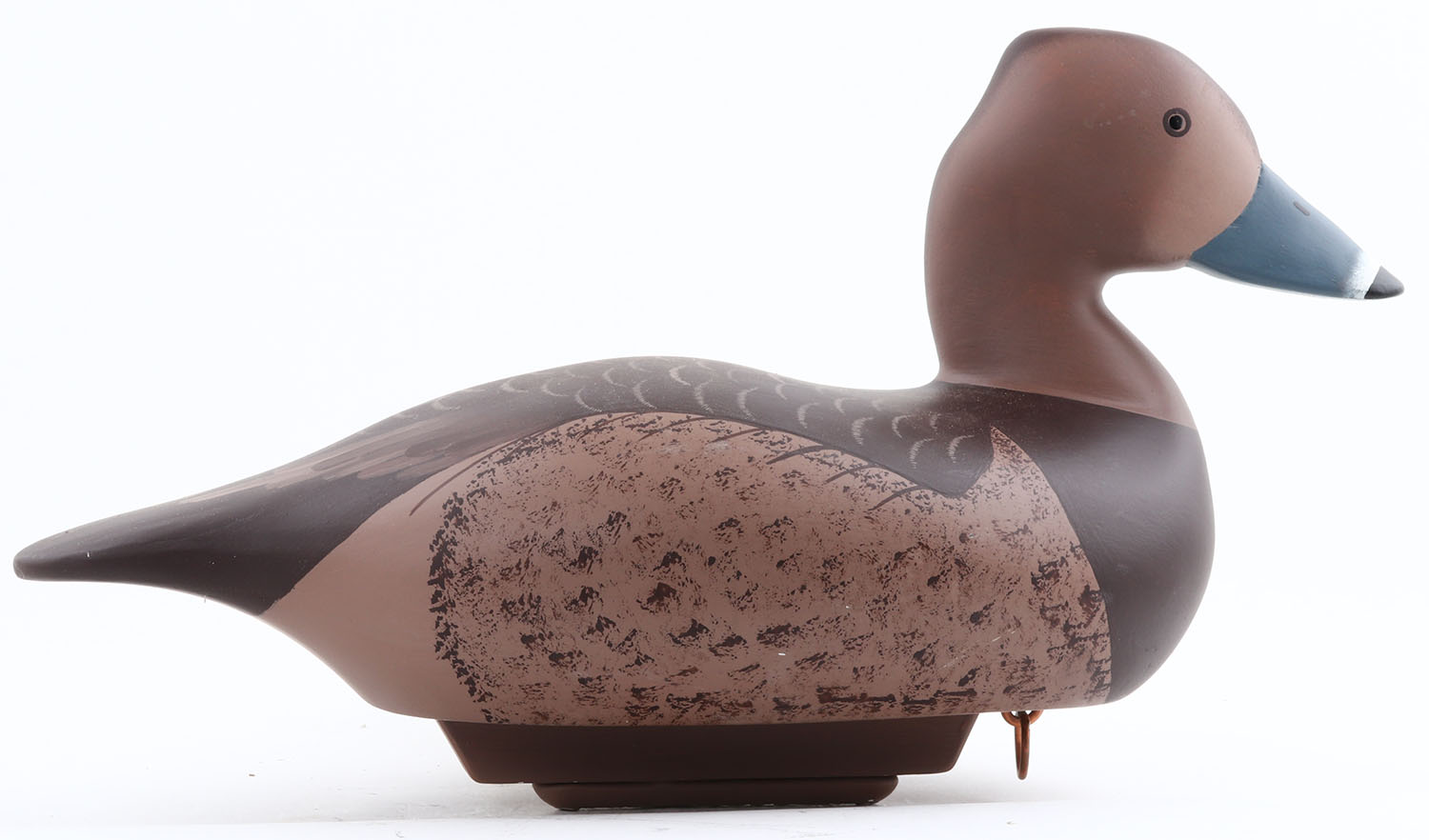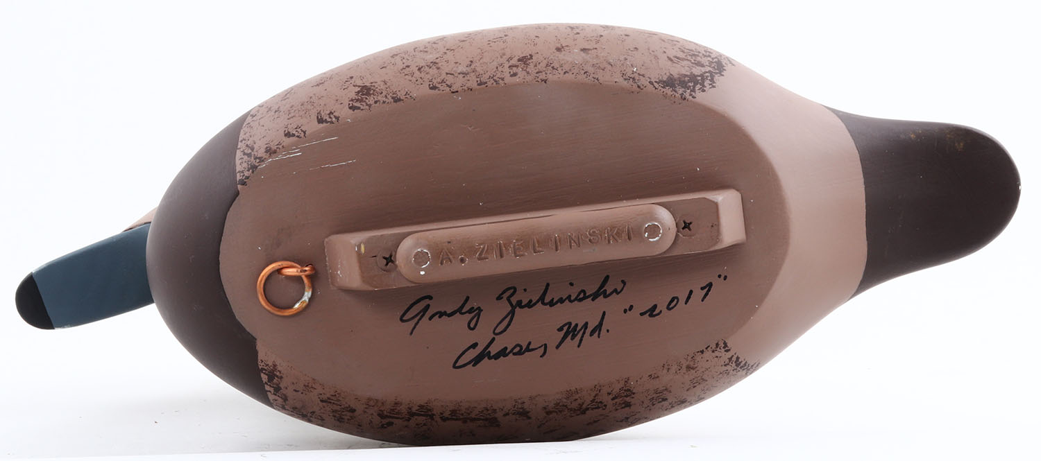 Bluebill Hen by Andy Zielinski, Chase, MD, painted eyes, solid wood, original paint, structurally excellent, signed on bottom, 15''. Grade: Excellent ++ - Value: 26 to 60