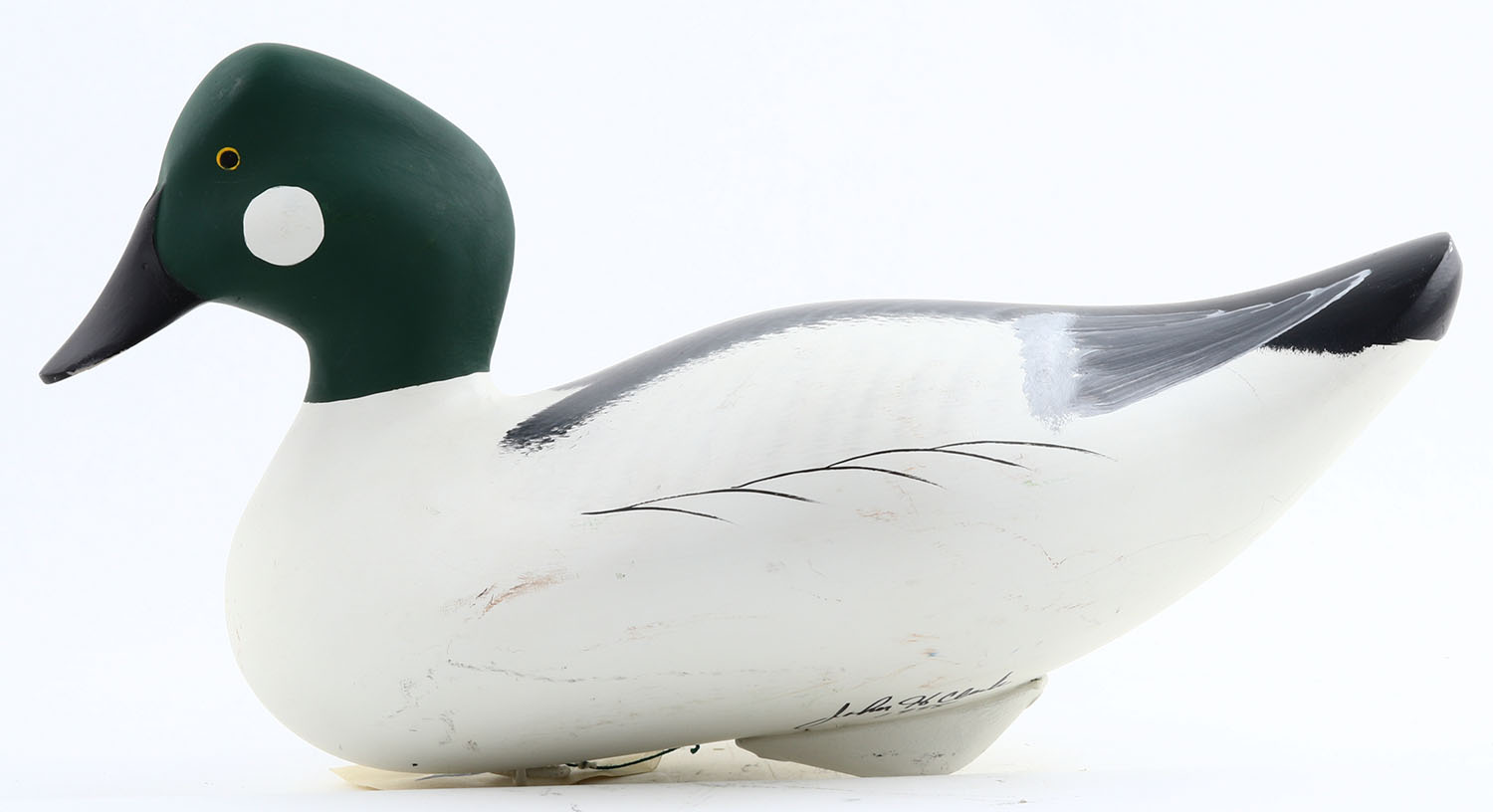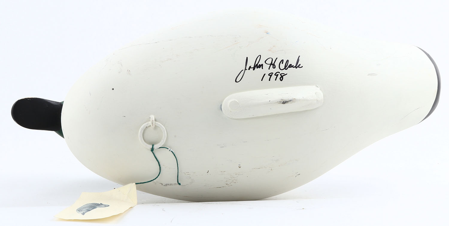 Goldeneye Drake by John H. Clark, Havre De Grace, MD, painted eyes, solid wood, original paint, structurally excellent, signed on bottom, 14'' OAL. Grade: Excellent + - Value: 40 to 80