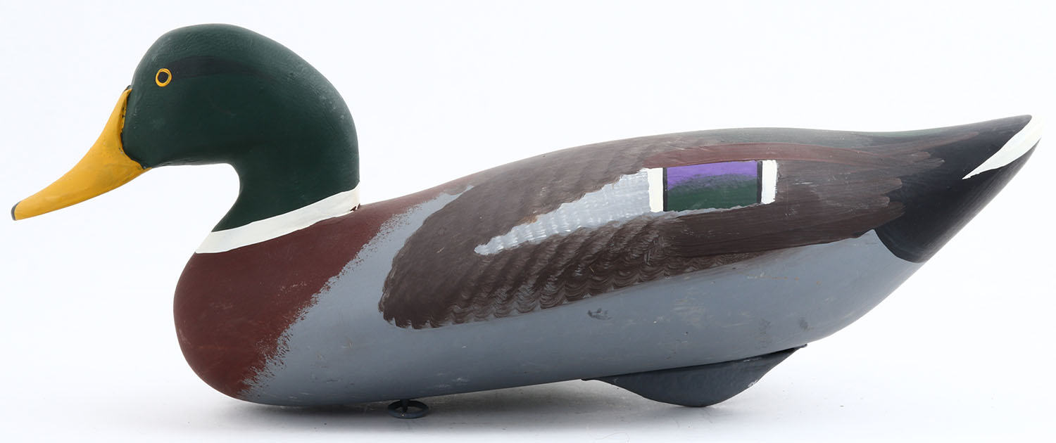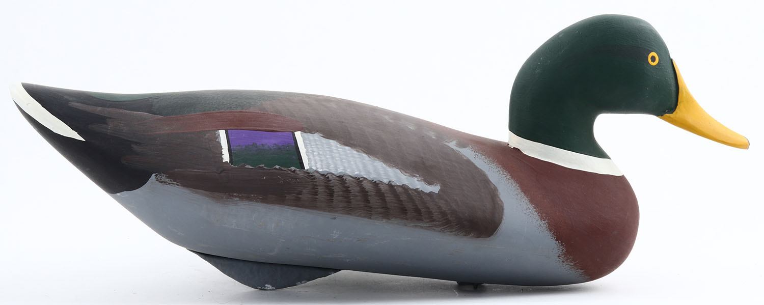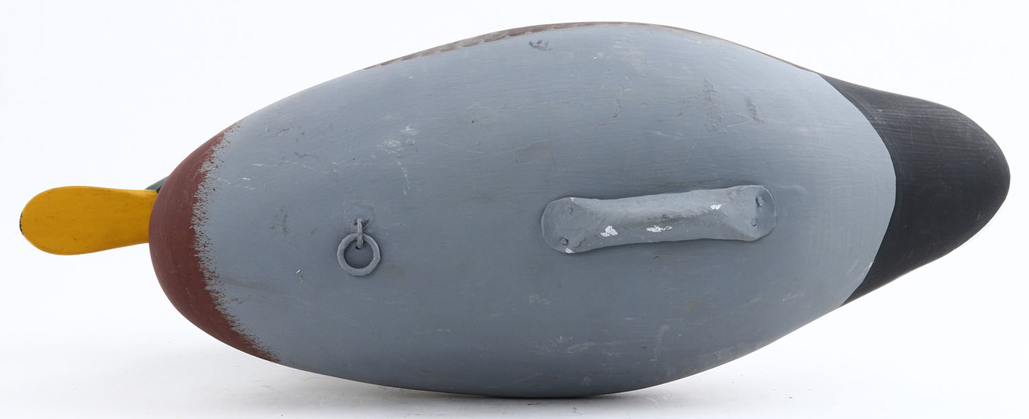 Mallard Drake by unknown MD maker, painted eyes, carved out bill, solid wood, original paint, structurally excellent, 17'': OAL. Grade: Excellent ++ - Value: 40 to 80