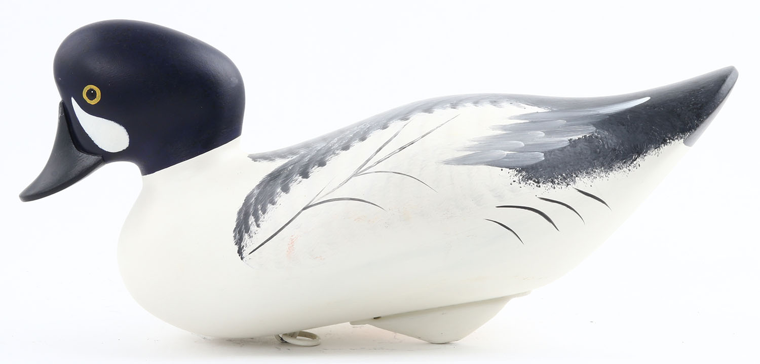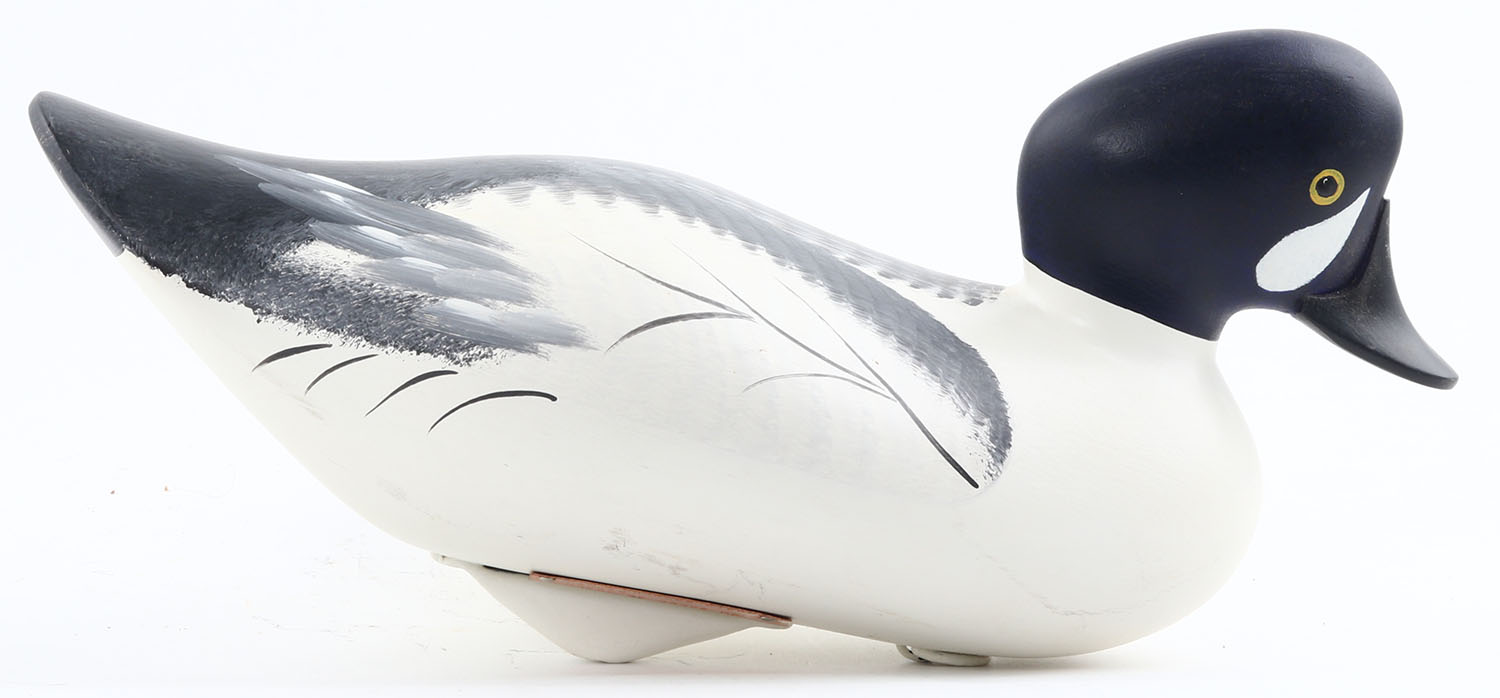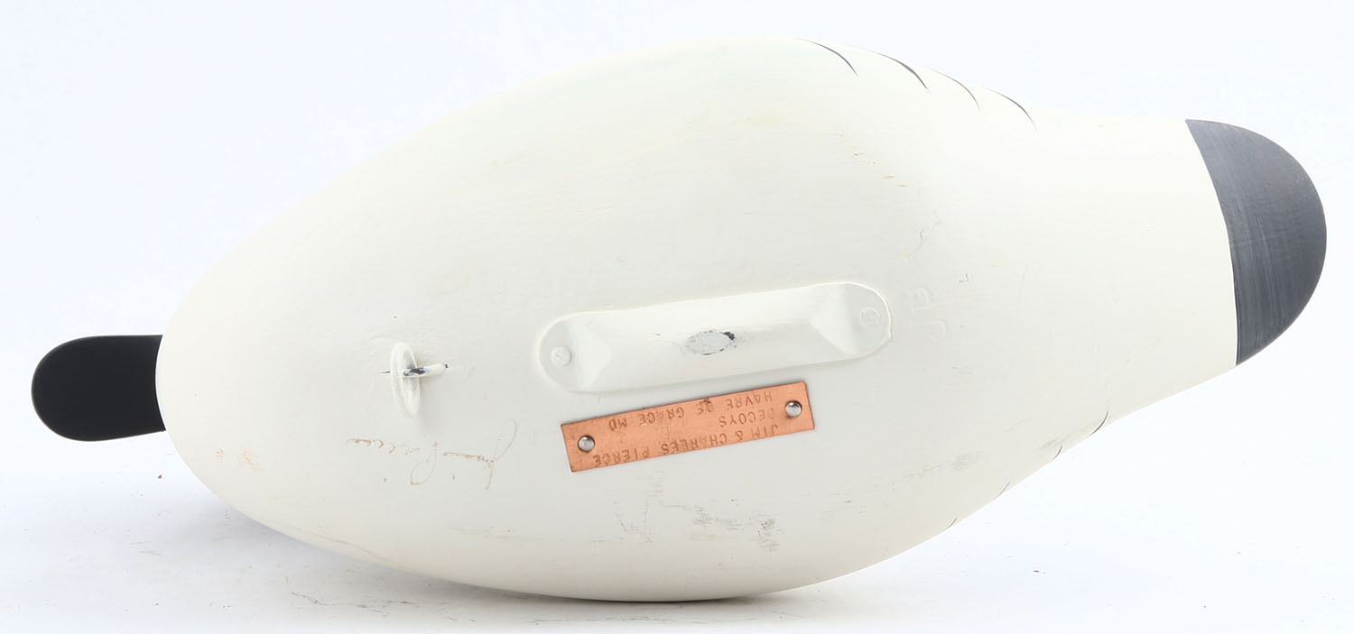 Goldeneye Drake by Jim & Charles Pierce, Havre De Grace MD, painted eyes, solid wood, structurally excellent, copper tag stamped ''Jim & Charles Pierce'' on bottom, 13'' OAL. Grade: MINT - Value: 50 to 150