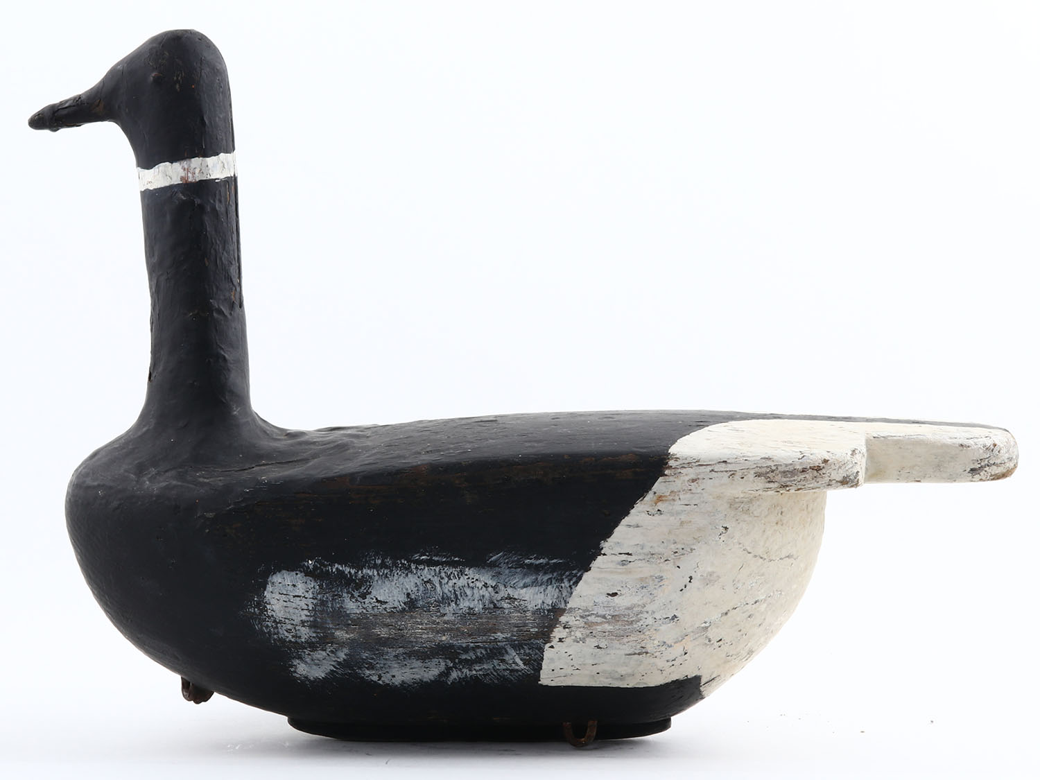 Black Brant by Russian Carl Willmann, no eyes, solid wood original paint with some working repaint to neck & head, he made three styles & 150 decoys in total, 18'' OAL. Grade: Very Good - Value: 50 to 250