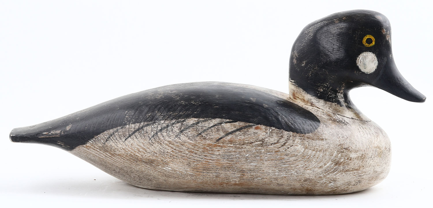 Goldeneye Drake by Bob Booth, Chincoteague Island, VA, PE, hollow wood, original paint, structurally excellent, signed on bottom, 13'' OAL. Grade: Excellent - Value: 40 to 80