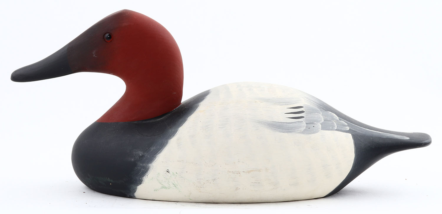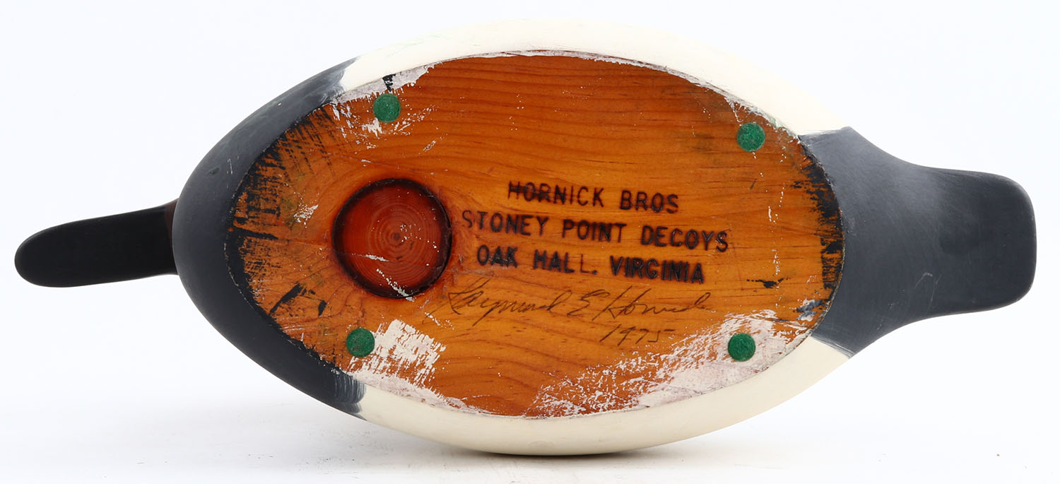 Canvasback Drake by Leonard E. Hornick, Stoney Point, GE, solid wood, original paint, structurally excellent, signed on bottom, 14'' OAL. Grade: Excellent ++ - Value: 30 to 60