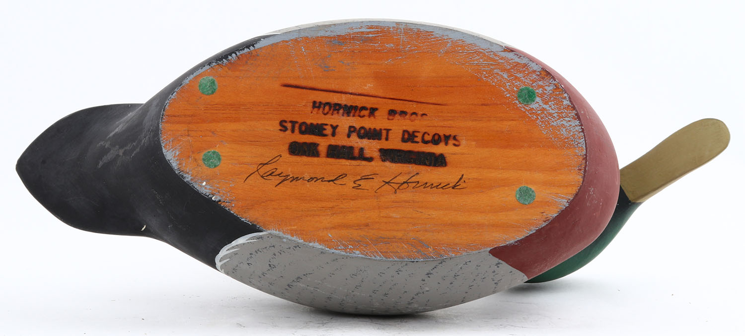 Mallard Drake by Leonard E. Hornick, Stoney Point, GE, solid wood, original paint, structurally excellent, signed on bottom, 14 1/2'' OAL. Grade: Excellent ++ - Value: 30 to 60