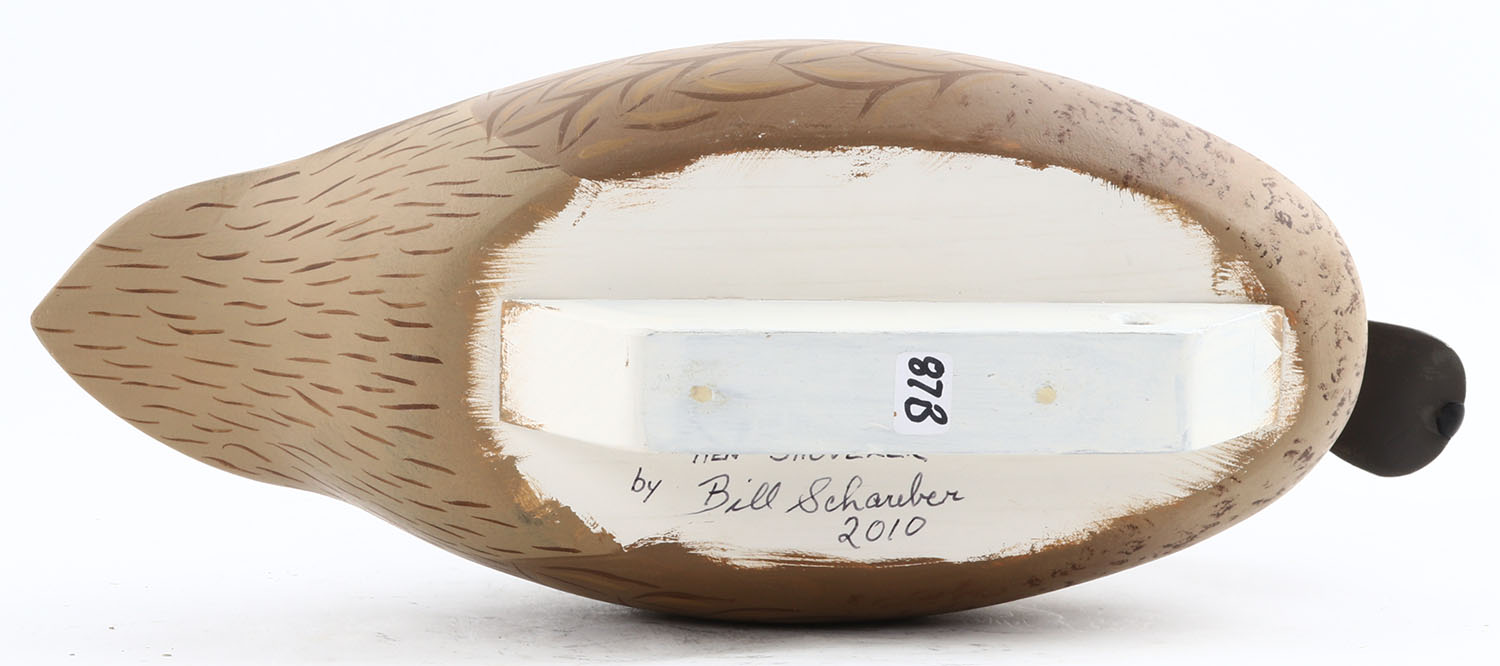 Shoveler Hen by Bill Schauber, Chestertown, MD, glass eyes, hollow wood, original paint, structurally excellent, signed on bottom. Grade: Excellent + - Value: 80 to 250