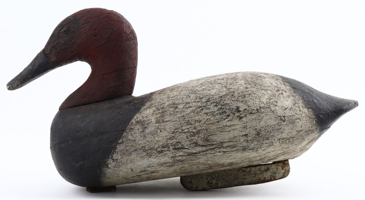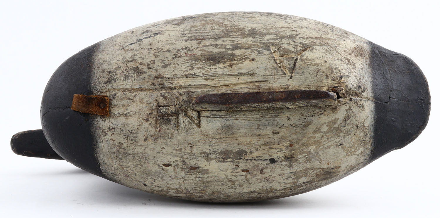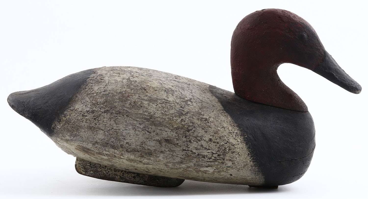 Canvasback Drake by unknown maker, TE, solid wood, old working repaint, structurally excellent, branded FN on bottom, 16'' OAL. Grade: Very Good + - Value: 20 to 60