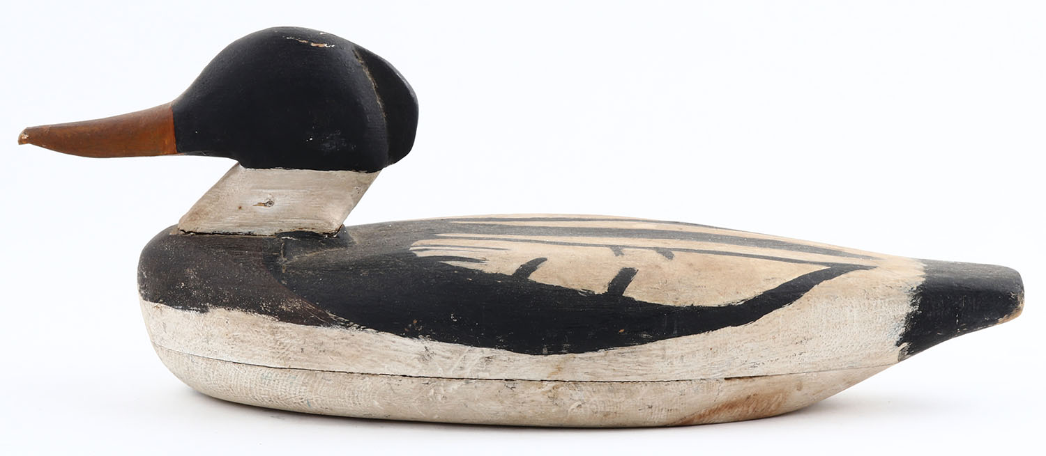 Hooded Merganser Drake by unknown maker, No Eyes, hollow wood, original paint, structurally excellent, 15'' OAL. Grade: Excellent - Value: 40 to 80