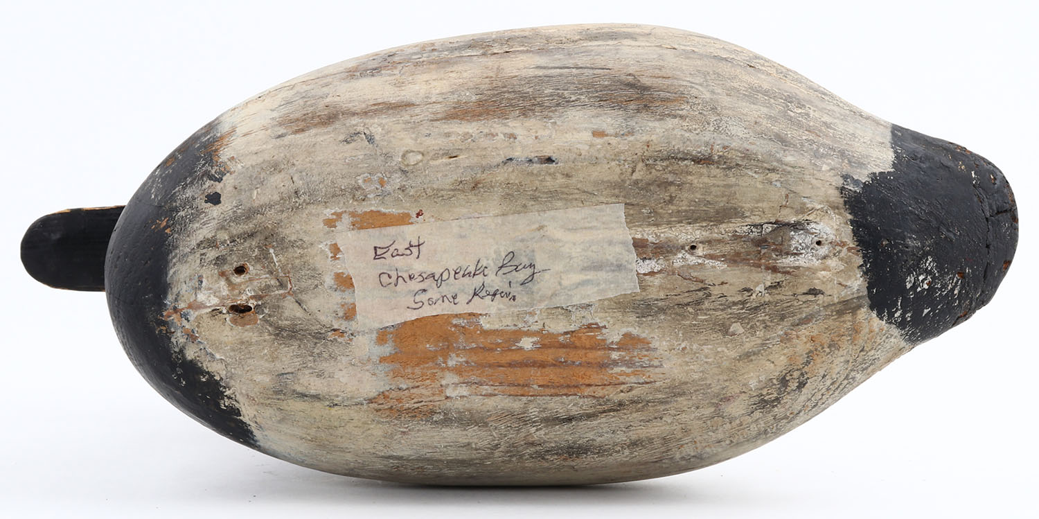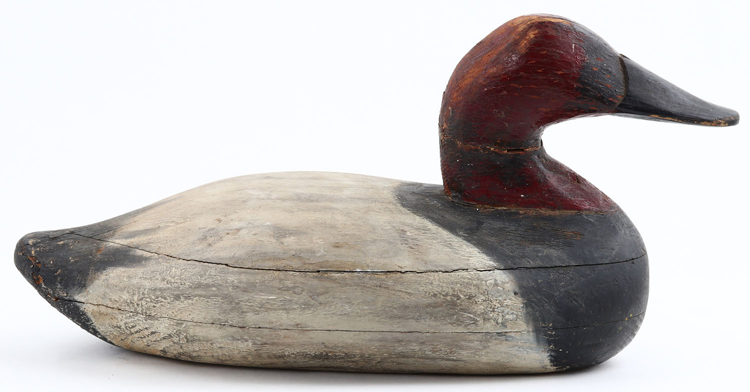 Canvasback Drake by unknown maker, no eyes, solid wood, original paint, neck has crack & been repaired, 14 OAL. Grade: Very Good + - Value: 50 to 100