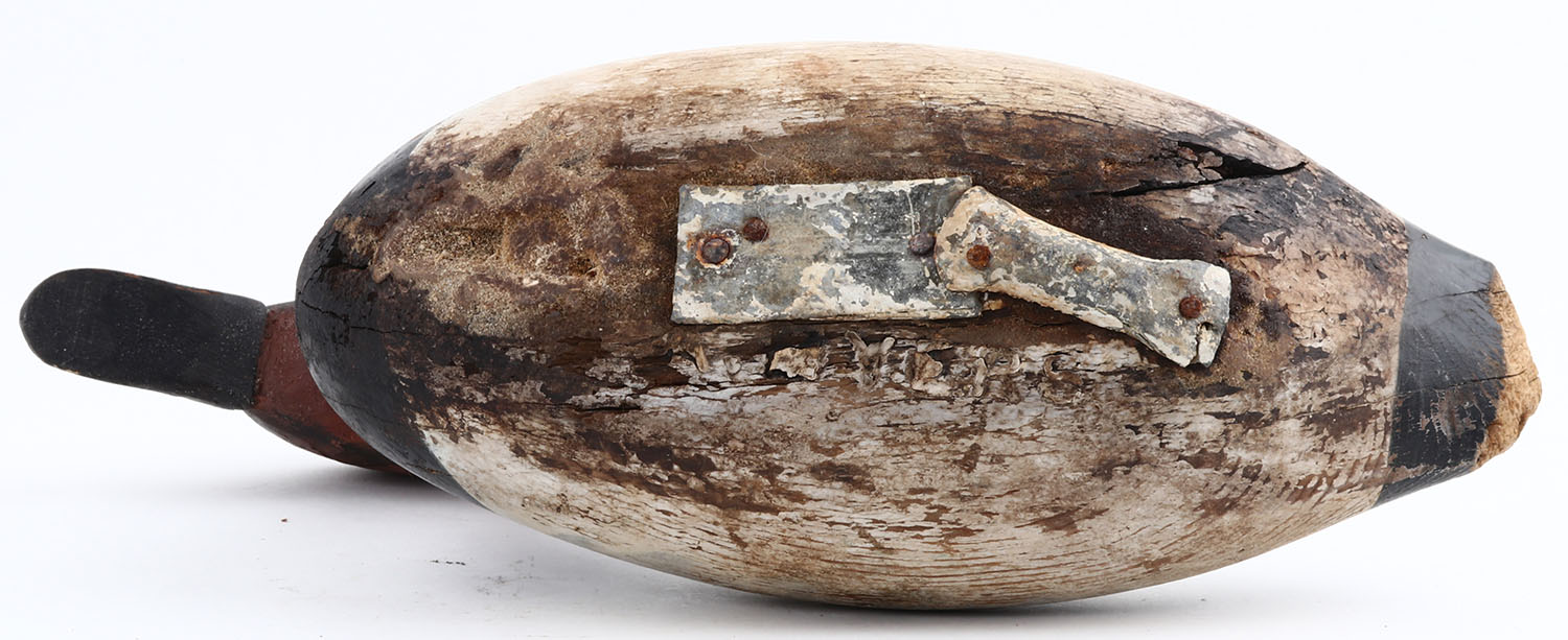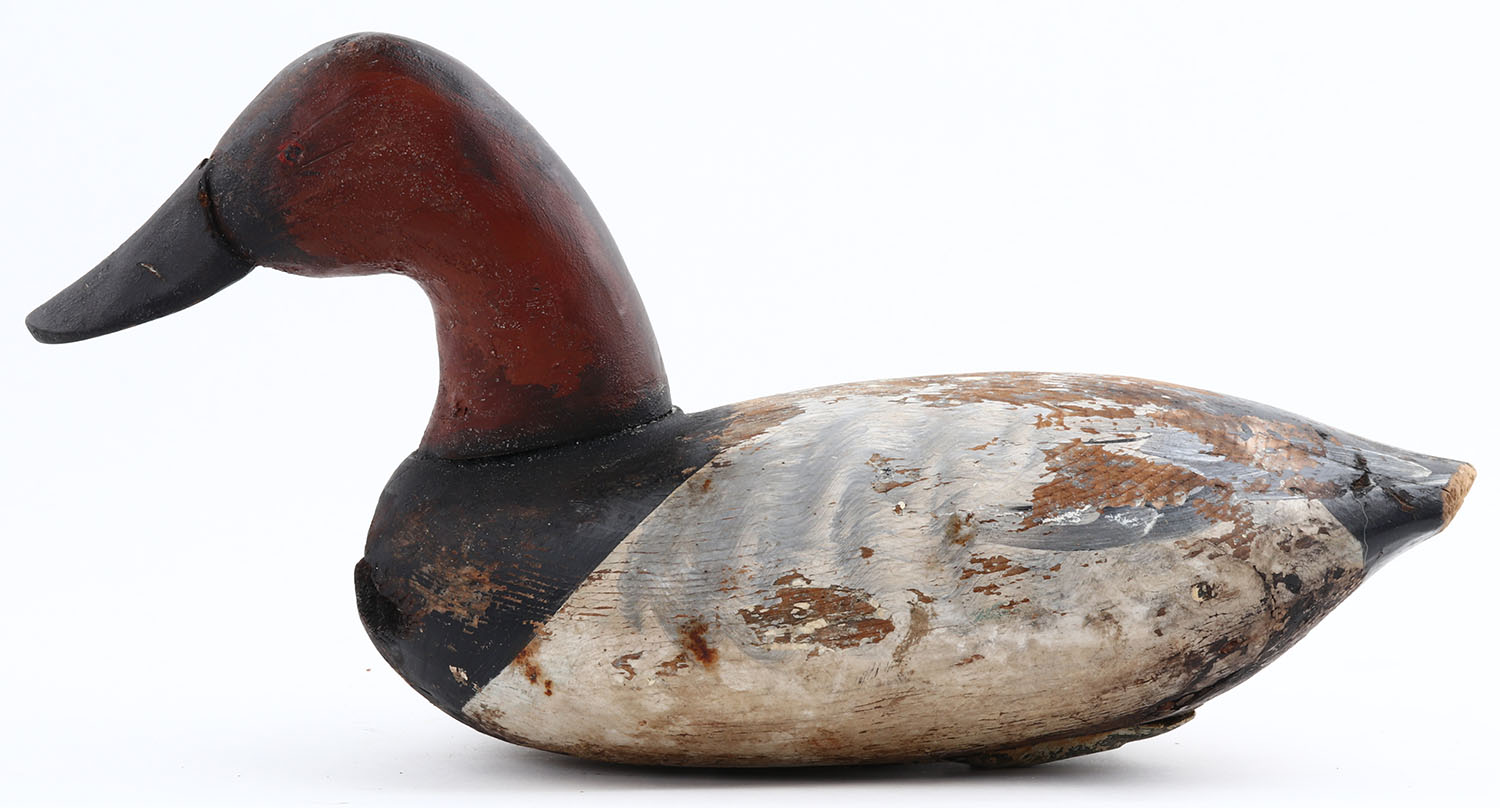 Early Canvasback Drake by unknown maker, PE, solid wood, original paint show wear, show swear to tail, 16'' OAL. Grade: Very Good - Value: 30 to 100