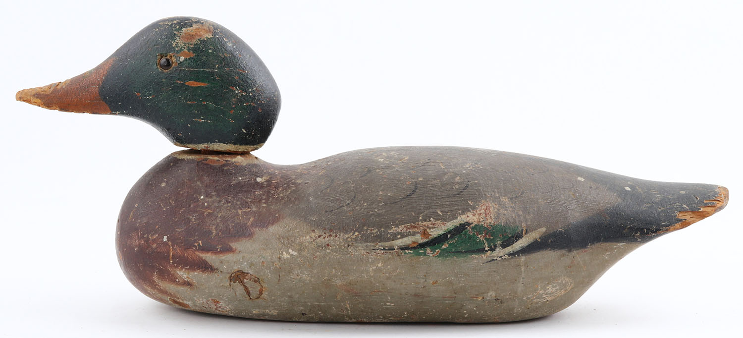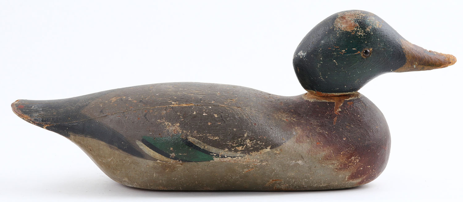 Standard Mallard Drake by Mason Decoy Company, Detroit, MI, 1896-1924. Glass eyes, solid wood, original paint, shows wear to bill & tail. Grade: Very Good - Value: 30 to 100