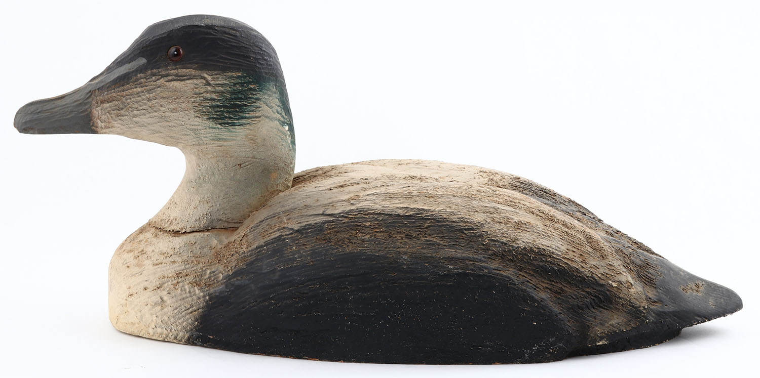 Eider Drake by Herters Decoy Co., Waseca, MN, 1893 series, glass eyes, solid wood, original paint, structurally excellent, marked on bottom. Grade: Excellent ++ - Value: 50 to 300