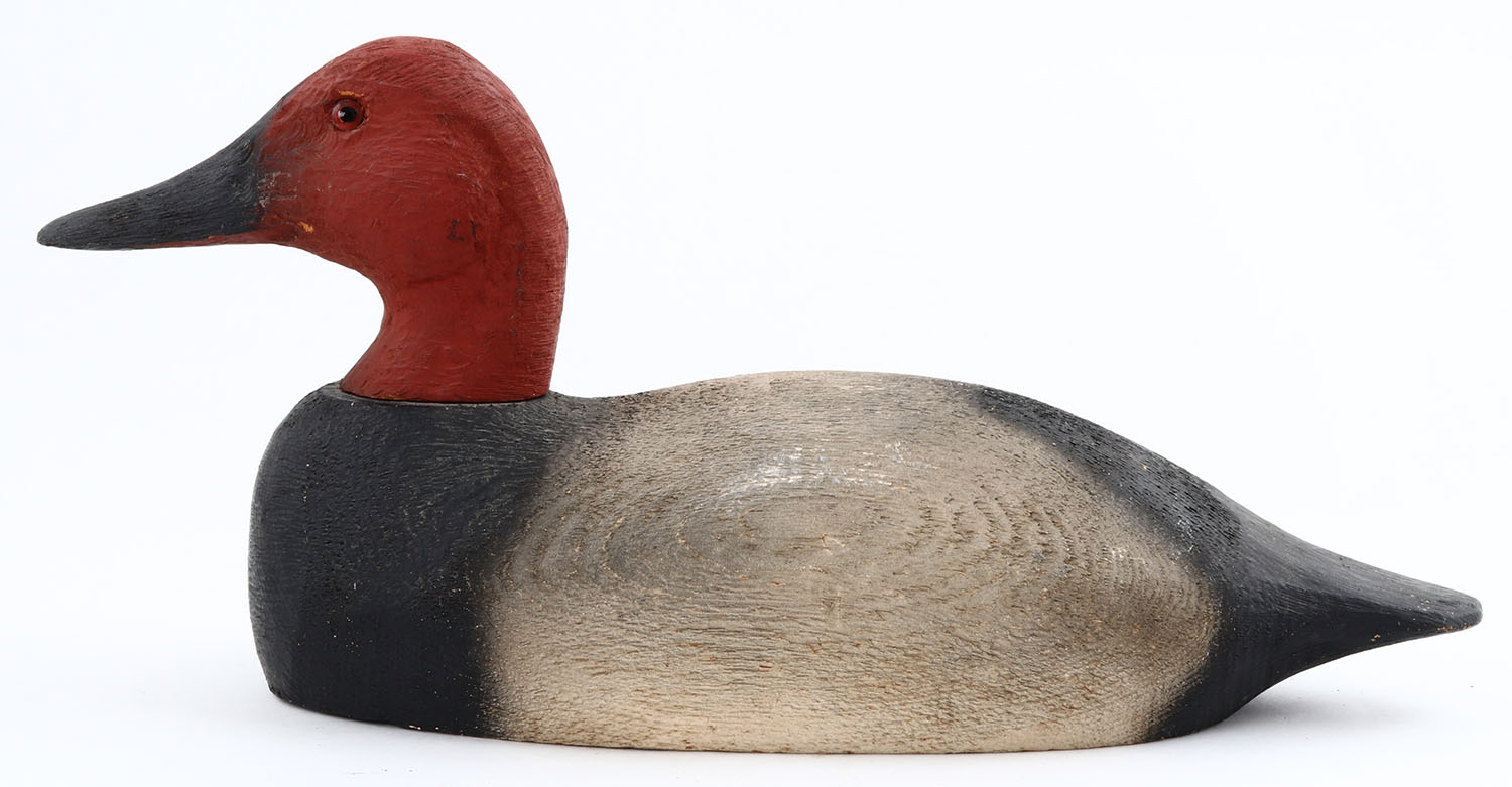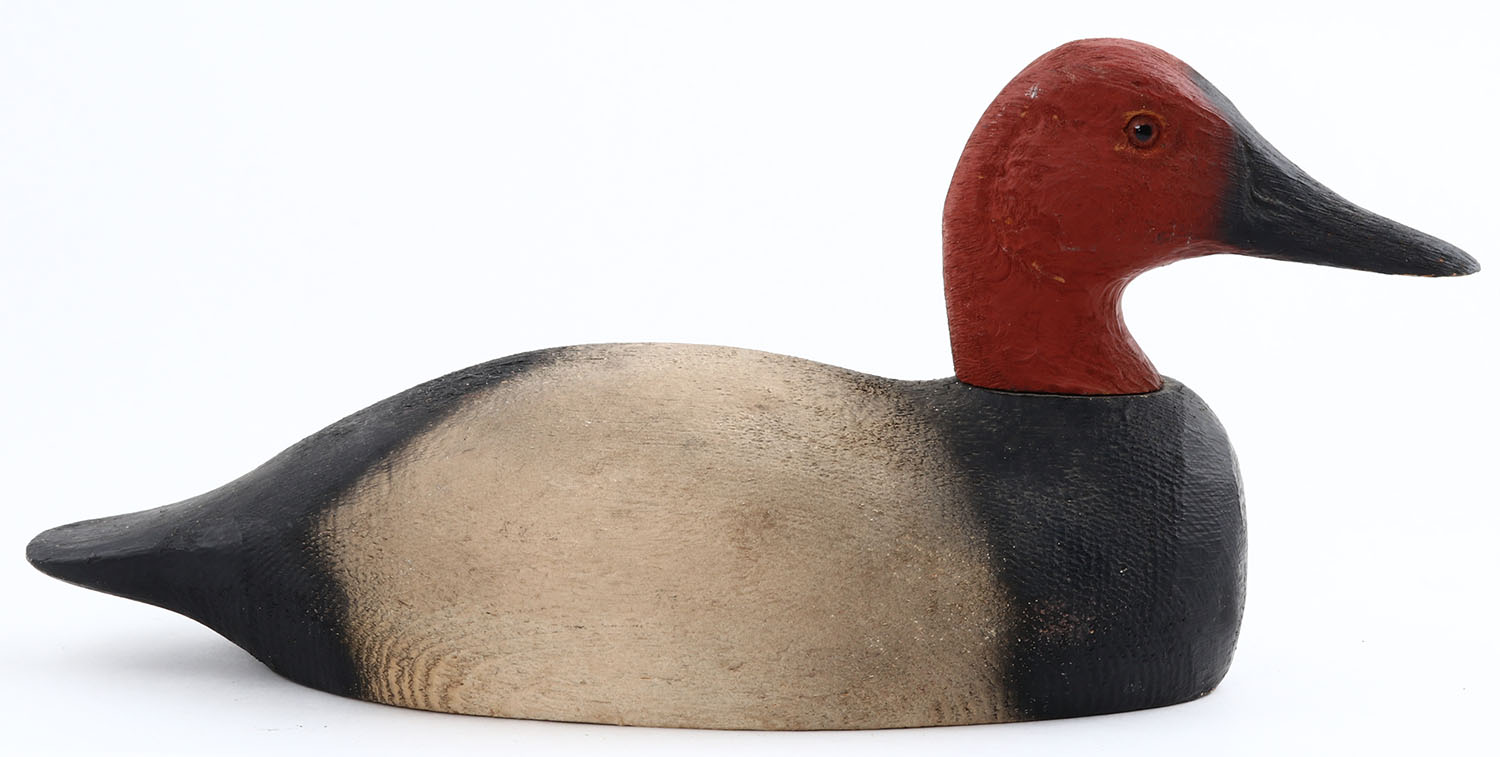Canvasback Drake by Herters Decoy Co., Waseca, MN, 1893 series, glass eyes, solid wood, original paint, structurally excellent, marked on bottom. Grade: Excellent ++ - Value: 50 to 300