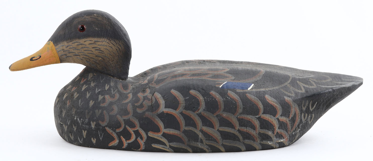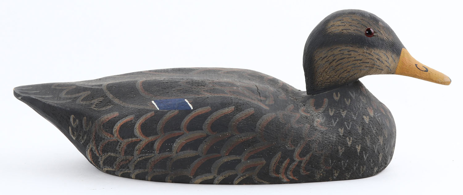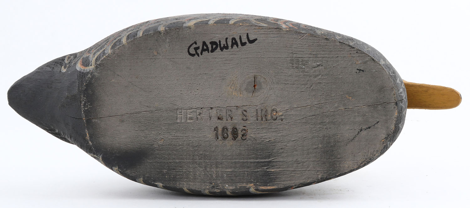 Rare Gadwall Drake by Herters Decoy Co., Waseca, MN, 1893 series, glass eyes, solid wood, original paint, structurally excellent, marked on bottom. Grade: Excellent ++ - Value: 50 to 300