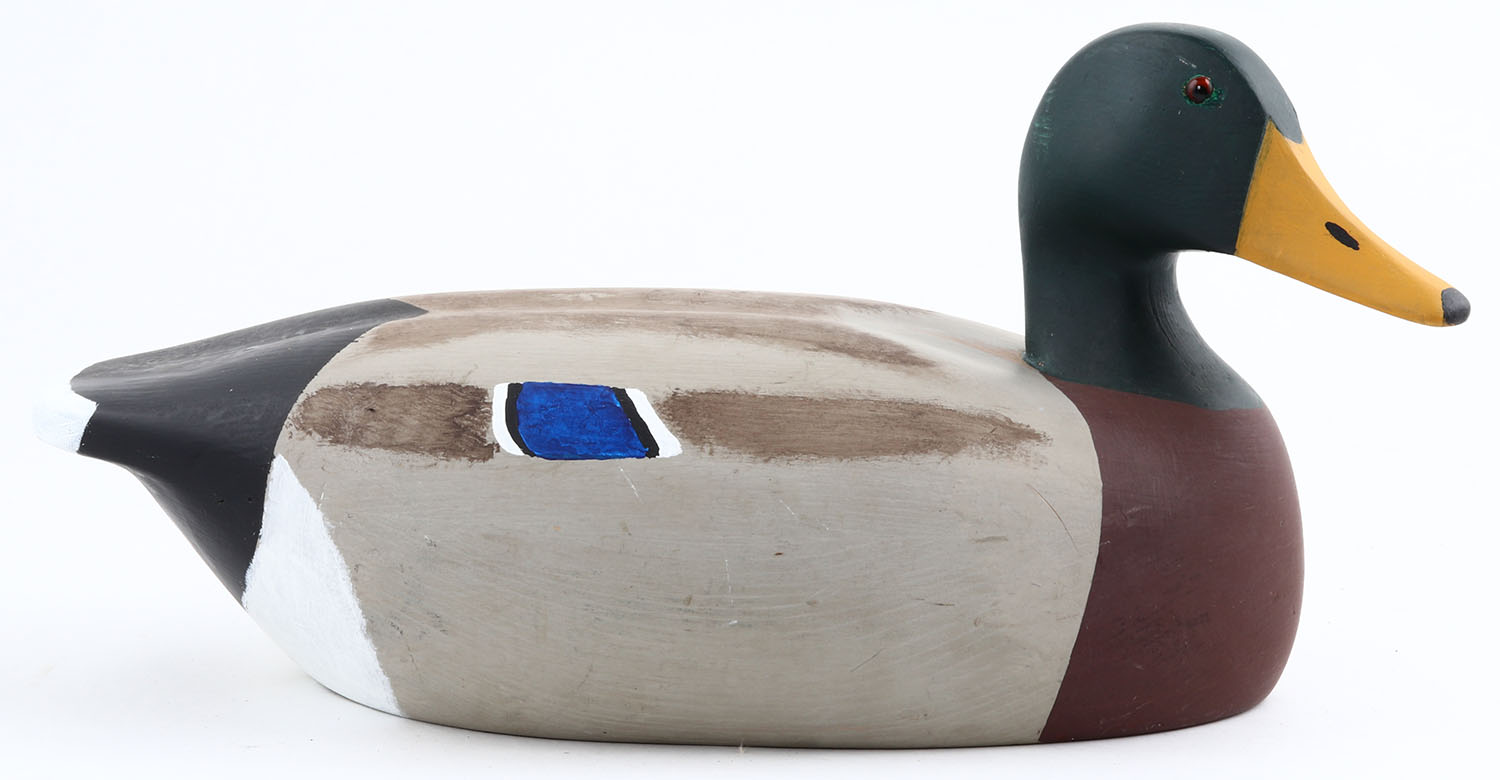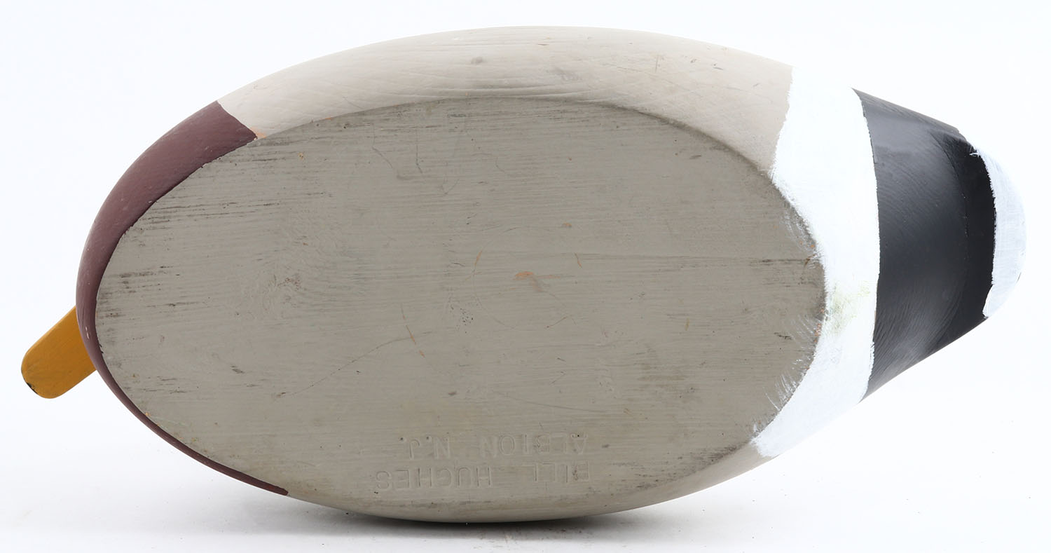 Mallard Drake by Bill Hughes, Albion N.J. GE, hollow wood, original paint, structurally excellent, branded on bottom. Grade: Excellent ++ - Value: 30 to 100