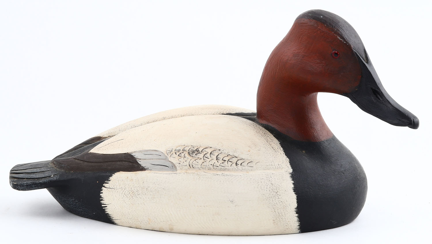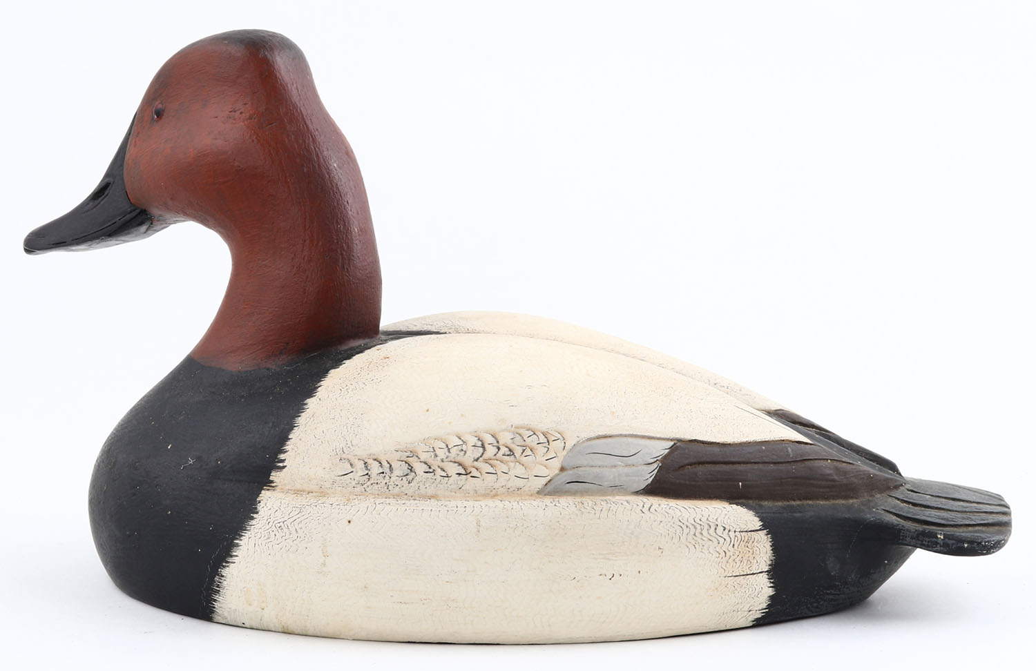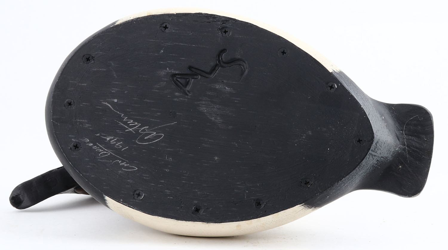 Canvasback Drake by Artum (ALS), GE, hollow wood, original paint, structurally excellent, signed on bottom by maker, 14'' OAL. Grade: Excellent - Value: 50 to 100