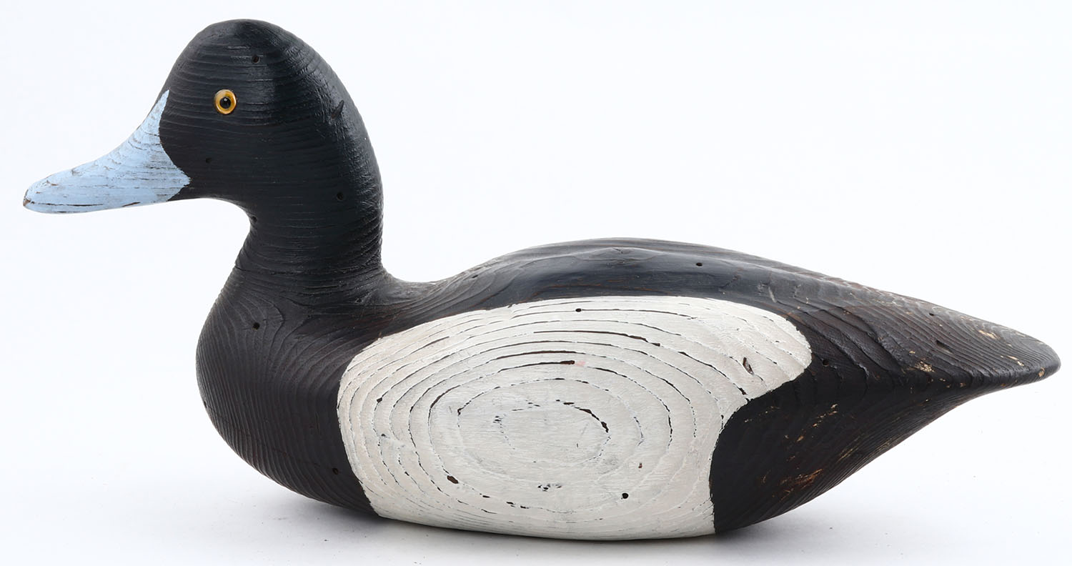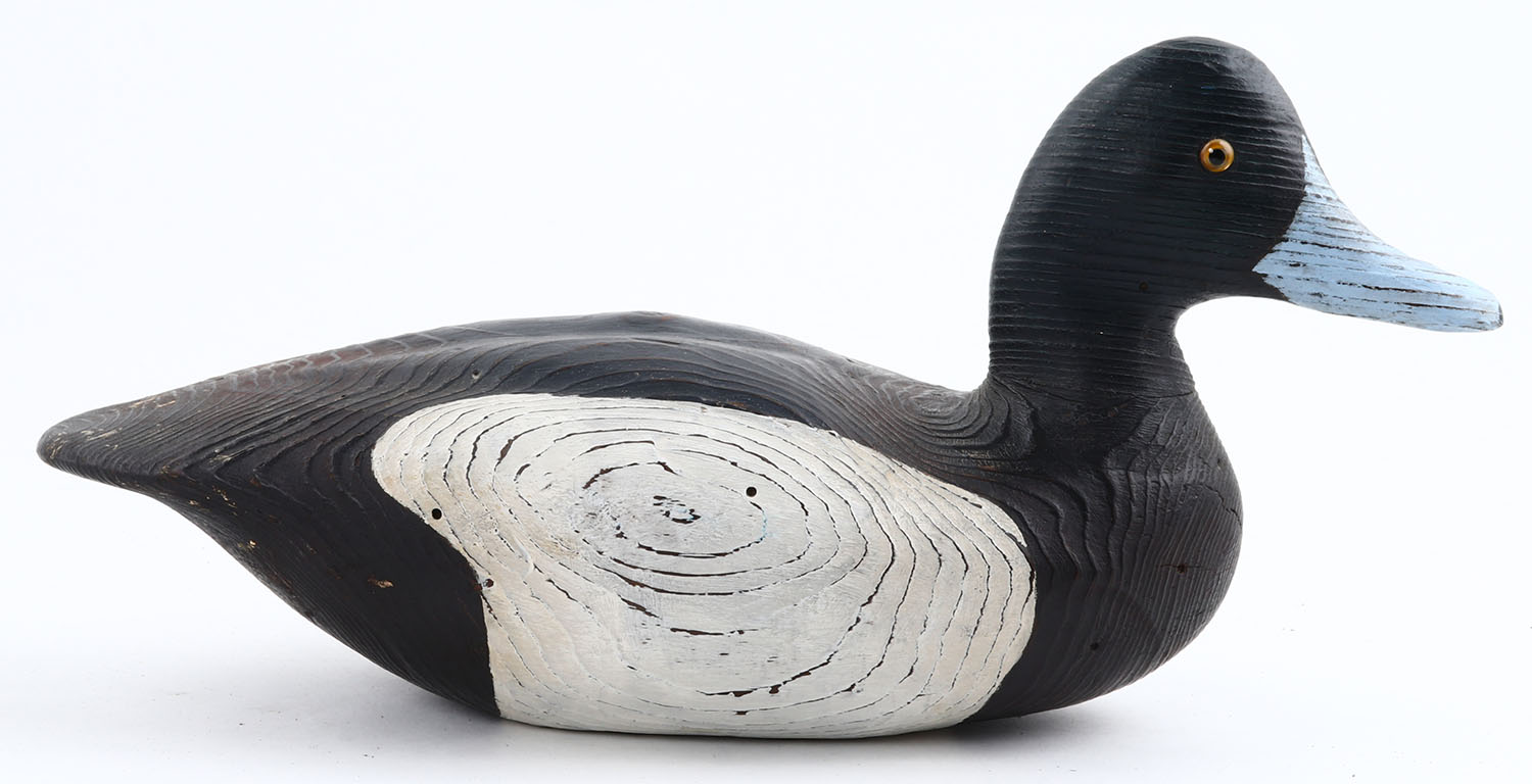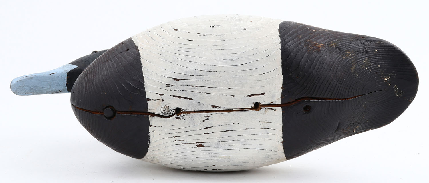 Bluebill Drake by unknown maker, GE, solid wood, original paint, structurally excellent but does have an age crack down center of belly. Grade: Excellent - Value: 30 to 60