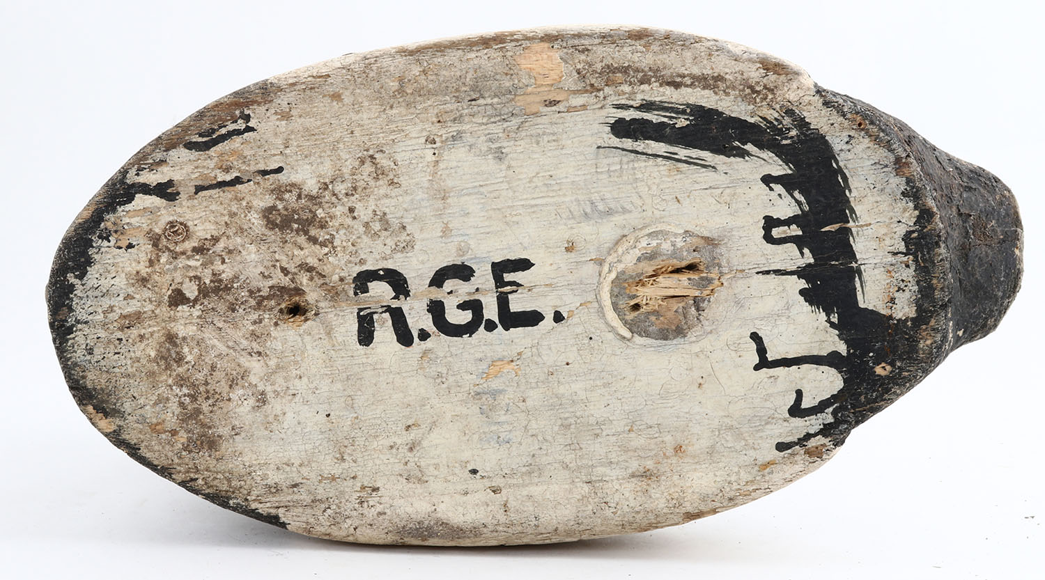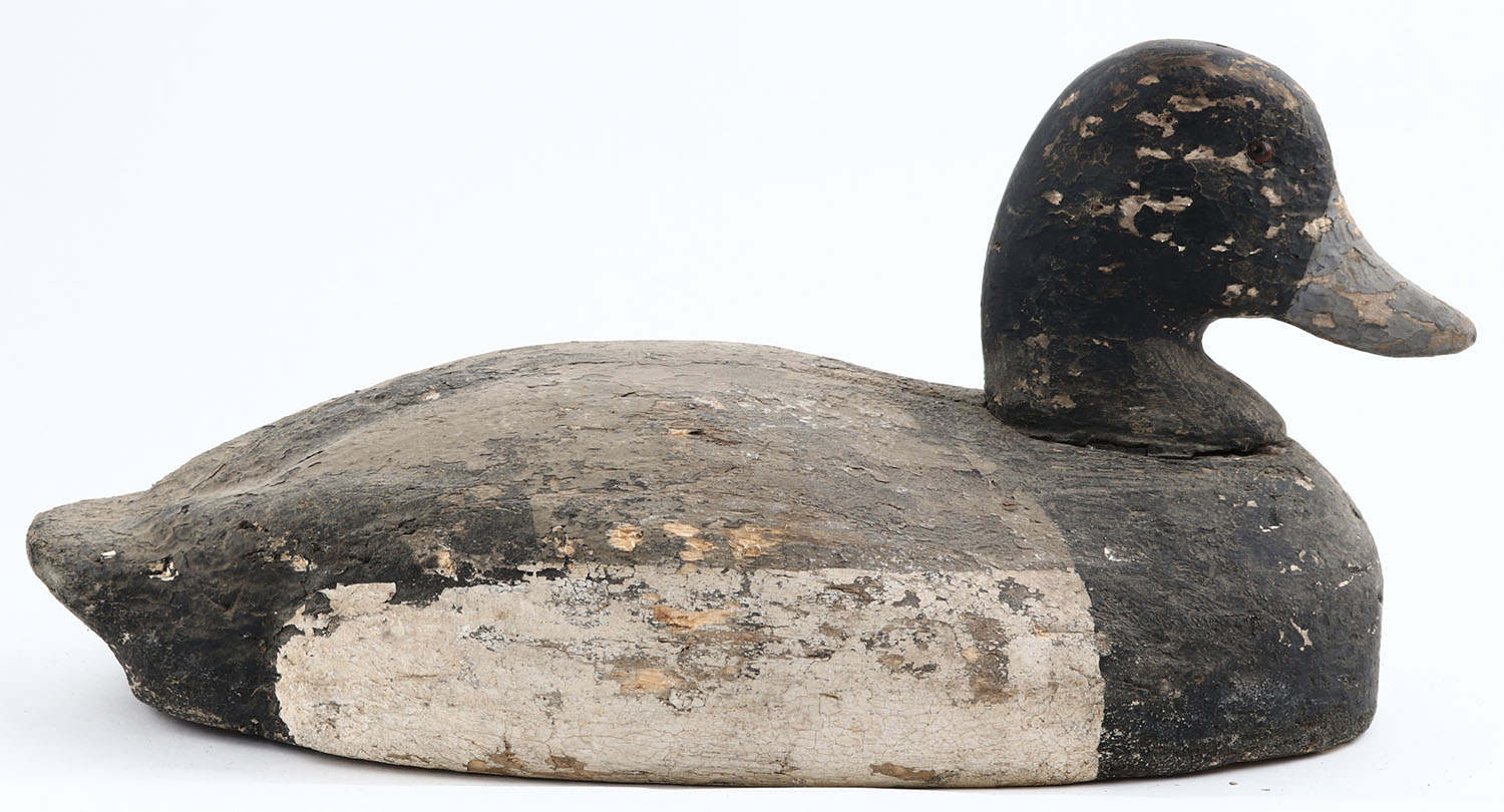 Bluebill Drake by unknown maker, GE, solid balsa wood, worn old repaint, structurally excellent. Grade: Very Good + - Value: 20 to 60