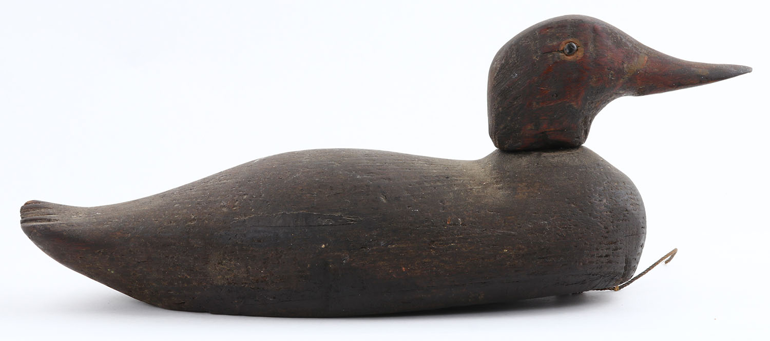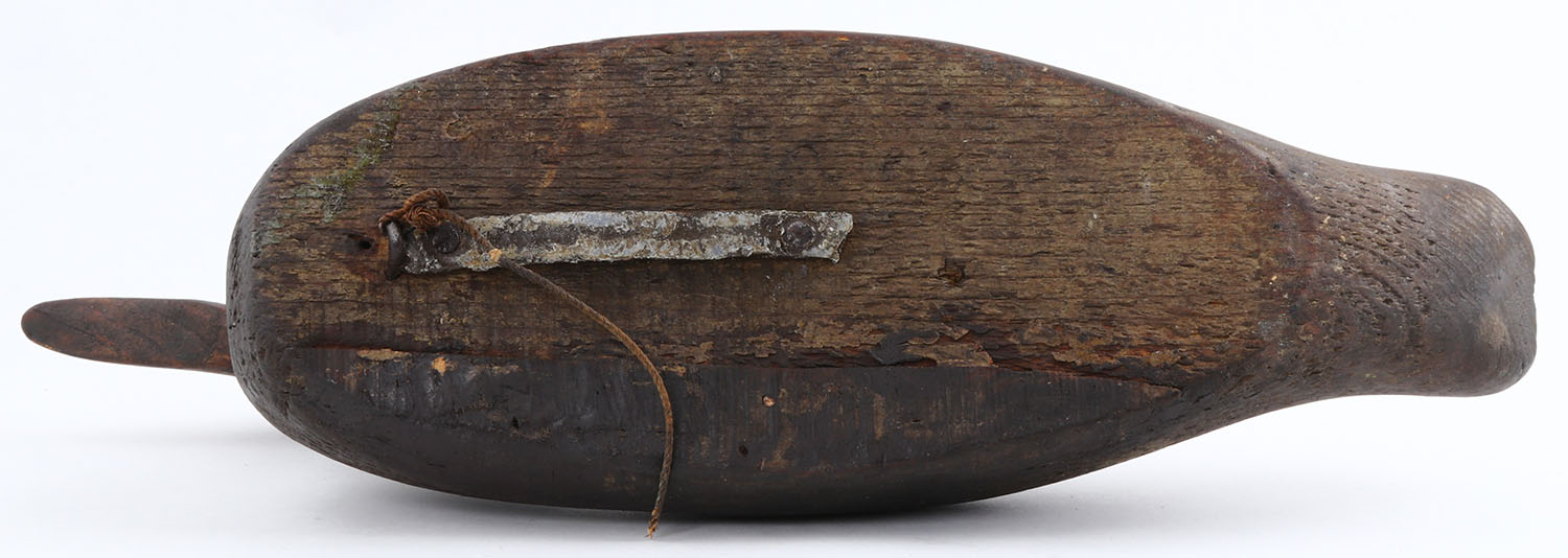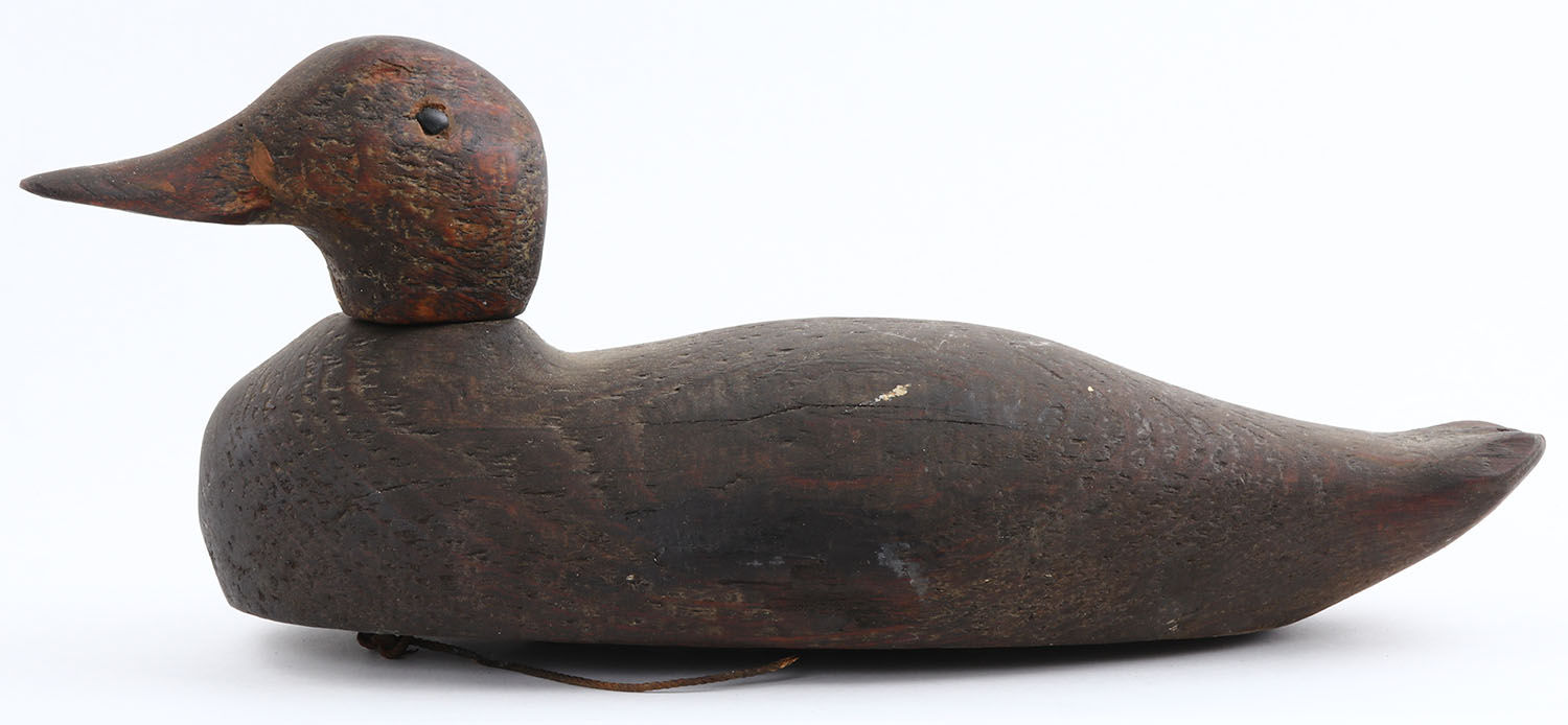 Mallard Hen by unknown maker, TE, solid wood, worn original paint, old chip to tail. Grade: Very Good - Value: 6 to 30