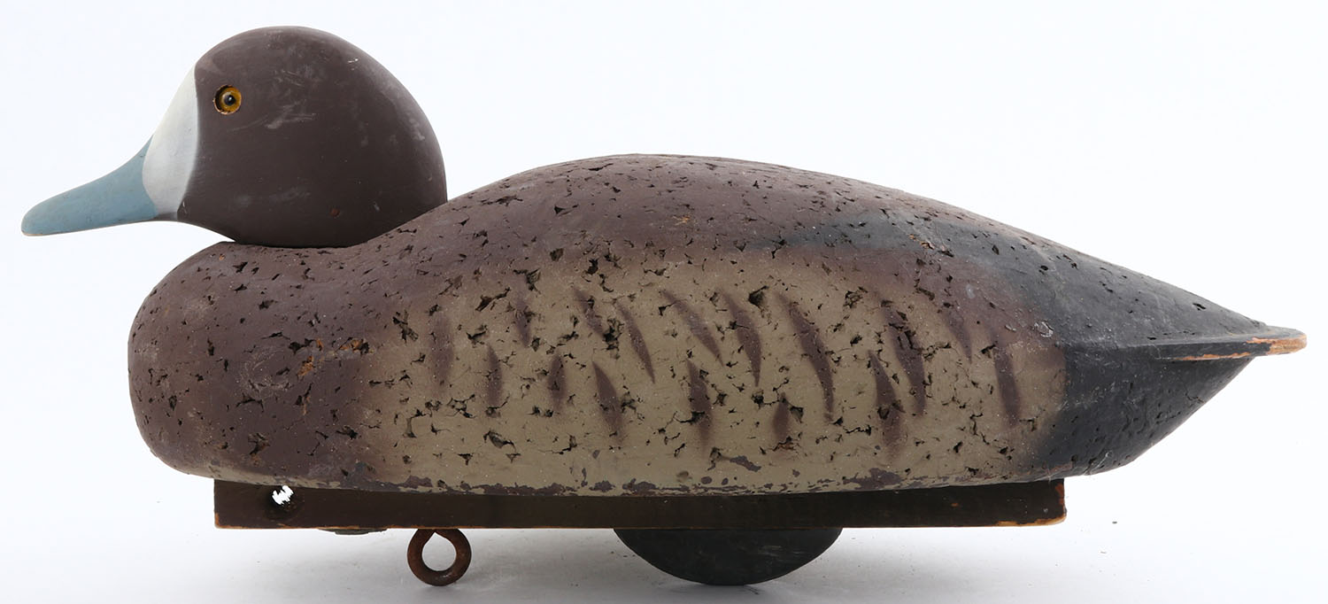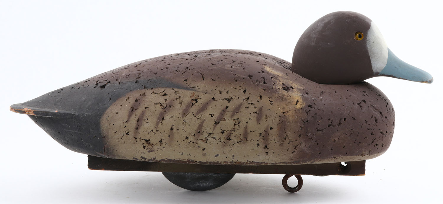 Bluebill Hen by LL Bean, unmarked on keel, glass eyes, solid cork body, wood head, original paint, structurally excellent, 17'' OAL. Grade: Excellent + - Value: 20 to 60