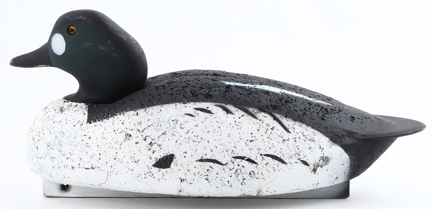 Goldeneye Drake by LL Bean, unmarked on keel, glass eyes, solid cork body, wood head, original paint, structurally excellent, 15'' OAL. Grade: Excellent ++ - Value: 20 to 60