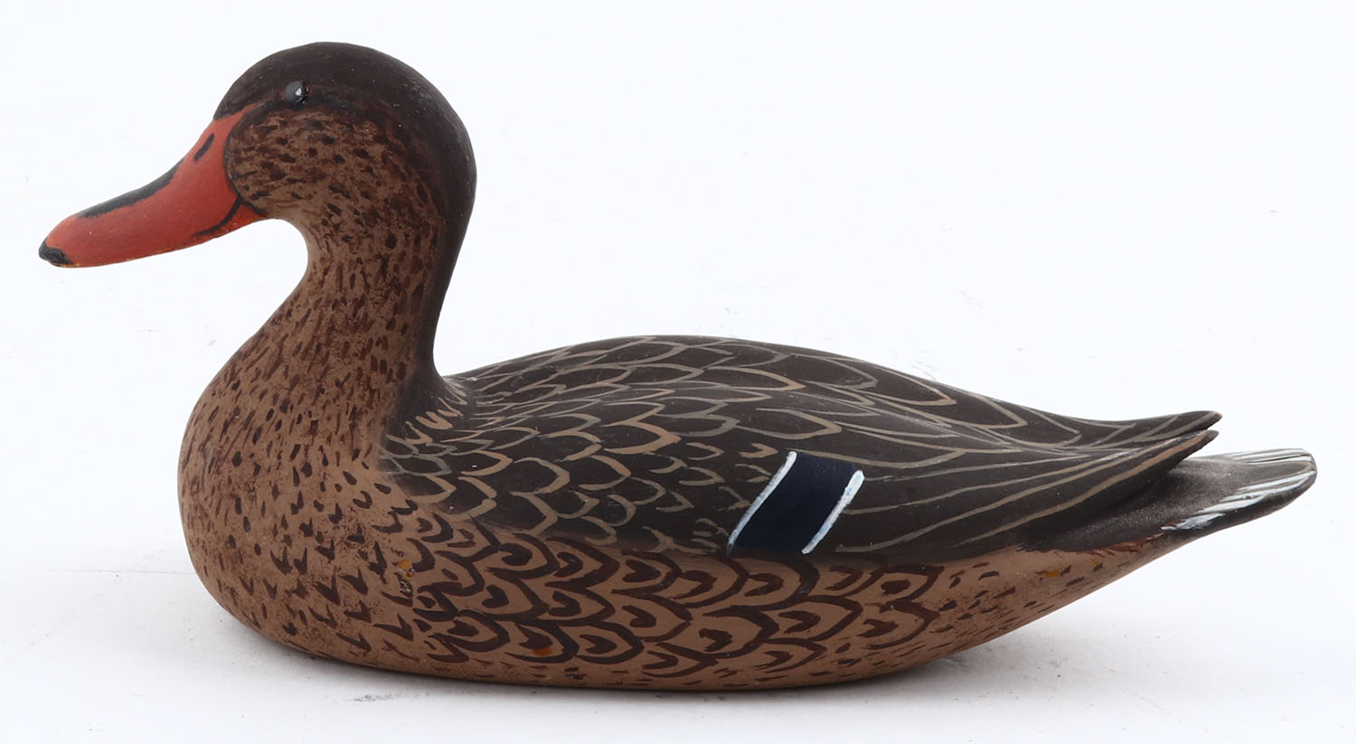 Miniature Mallard Hen by unknown maker & painted by Larrry Rucker and so marked on bottom, PE, solid wood, mint paint, 6'' OAL. Grade: MINT - Value: 30 to 60
