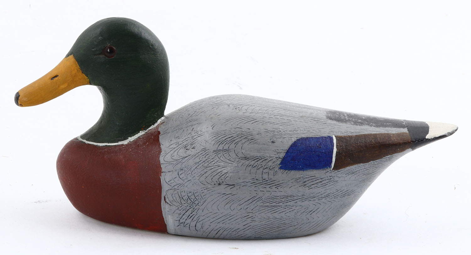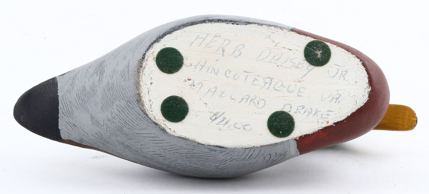Miniature Mallard Drake by Herb Daisey Jr., Chincuteaque, VA and so marked on bottom, GE, solid wood, mint paint, 5 1/2'' OAL. Grade: MINT - Value: 10 to 30