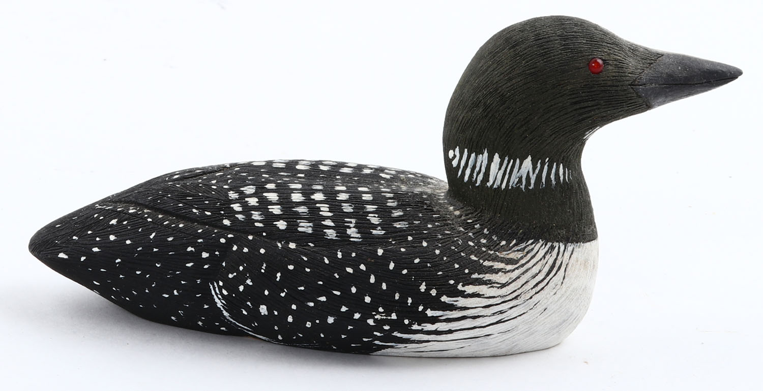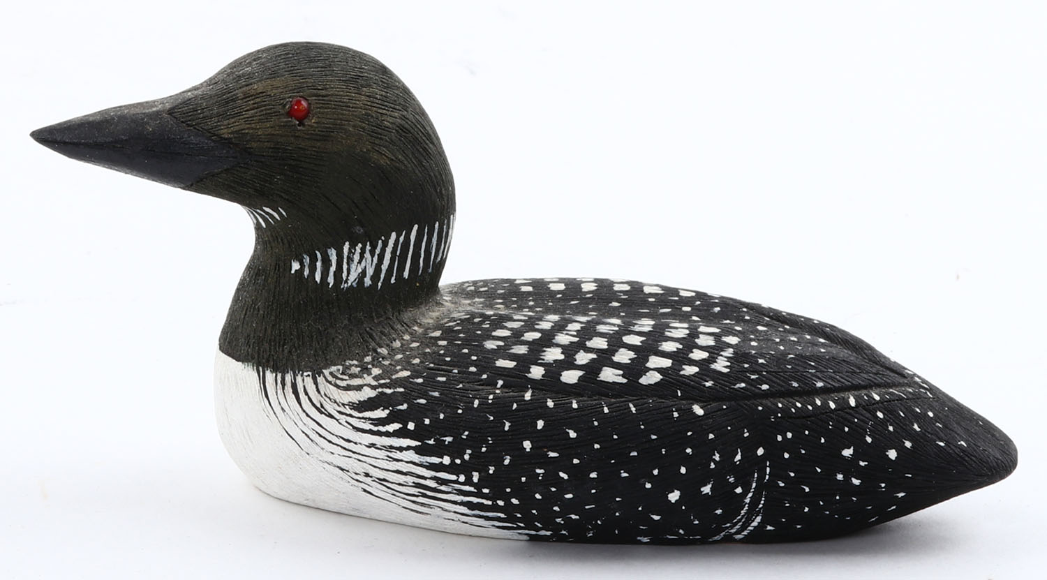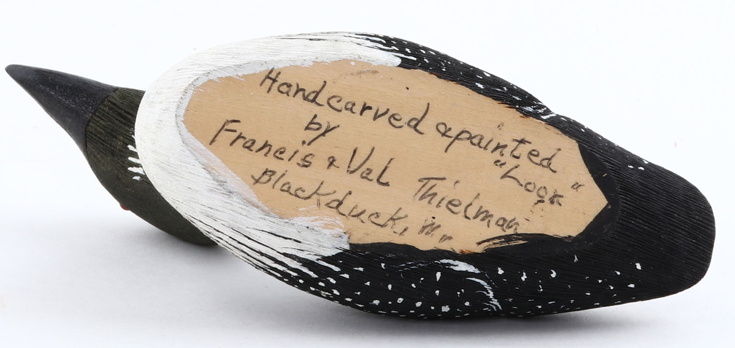 Miniature Loon by Francis & Val Thielman, Blackduck, MN and so marked on bottom, GE, solid wood, mint paint, 5'' OAL. Grade: MINT - Value: 10 to 40