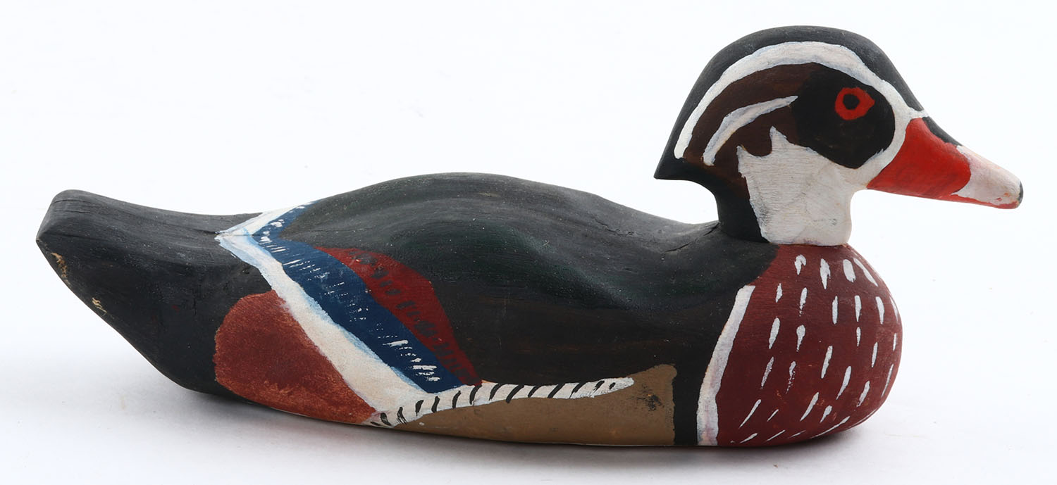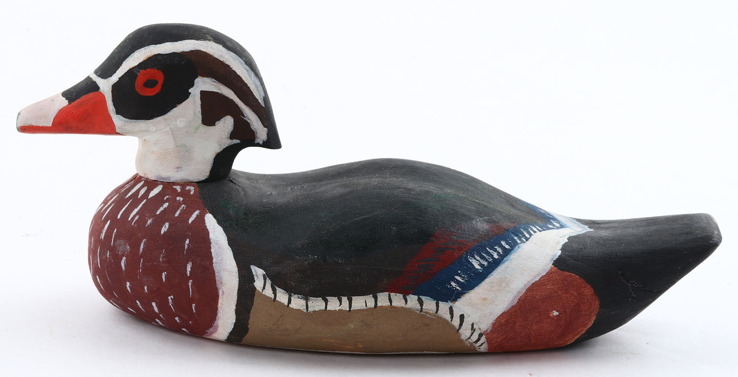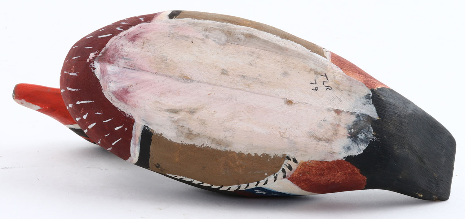 Miniature Woodduck Drake by TLR and so marked on bottom, PE, solid wood, mint paint, 7'' OAL. Grade: MINT - Value: 10 to 40