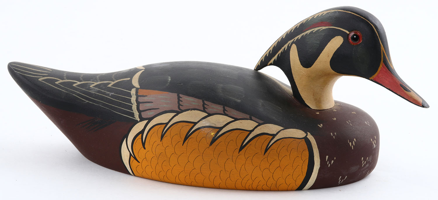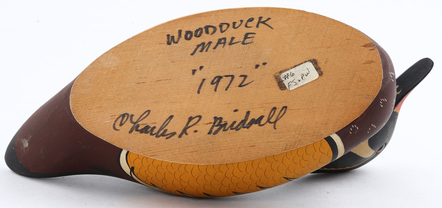 Miniature Woodduck Drake by Charles R Bridsall and so marked on bottom, GE, solid wood, mint paint, circa 1972, 10'' OAL. Grade: MINT - Value: 50 to 400
