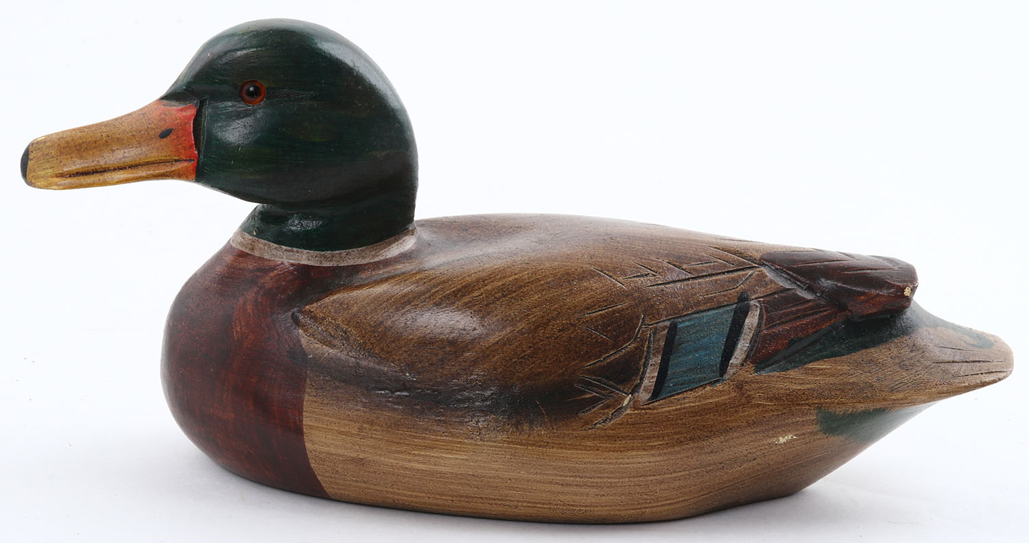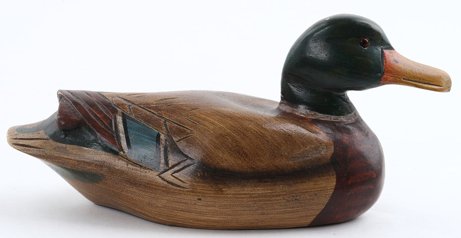 Miniature Mallard Drake by Unknown maker, GE, solid wood, mint paint, 9'' OAL. Grade: MINT - Value: 10 to 30