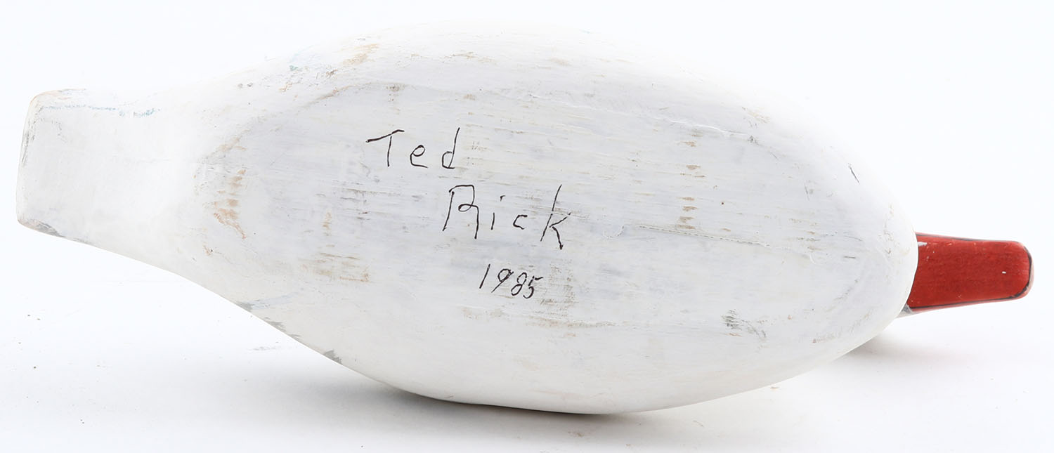Miniature Snow Goose by Ted Rick and so marked on bottom, GE, solid wood, mint paint, circa 1985, 8'' OAL. Grade: MINT - Value: 20 to 60