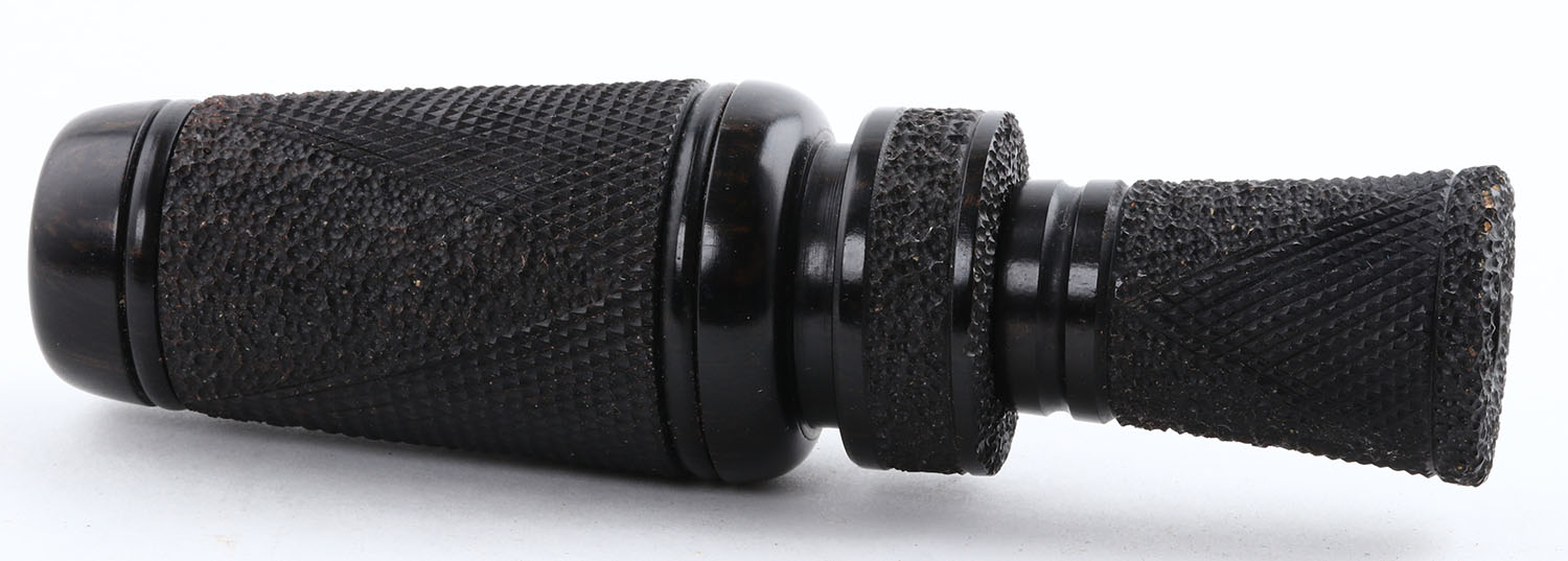 Wes Townzen Duck Call, Grafton, IL, 1945, signed inside, plastic reed, 5 1/2'' OAL, checkered & punch dot work, nice finish. Grade: Excellent - Value: 140 to 250
