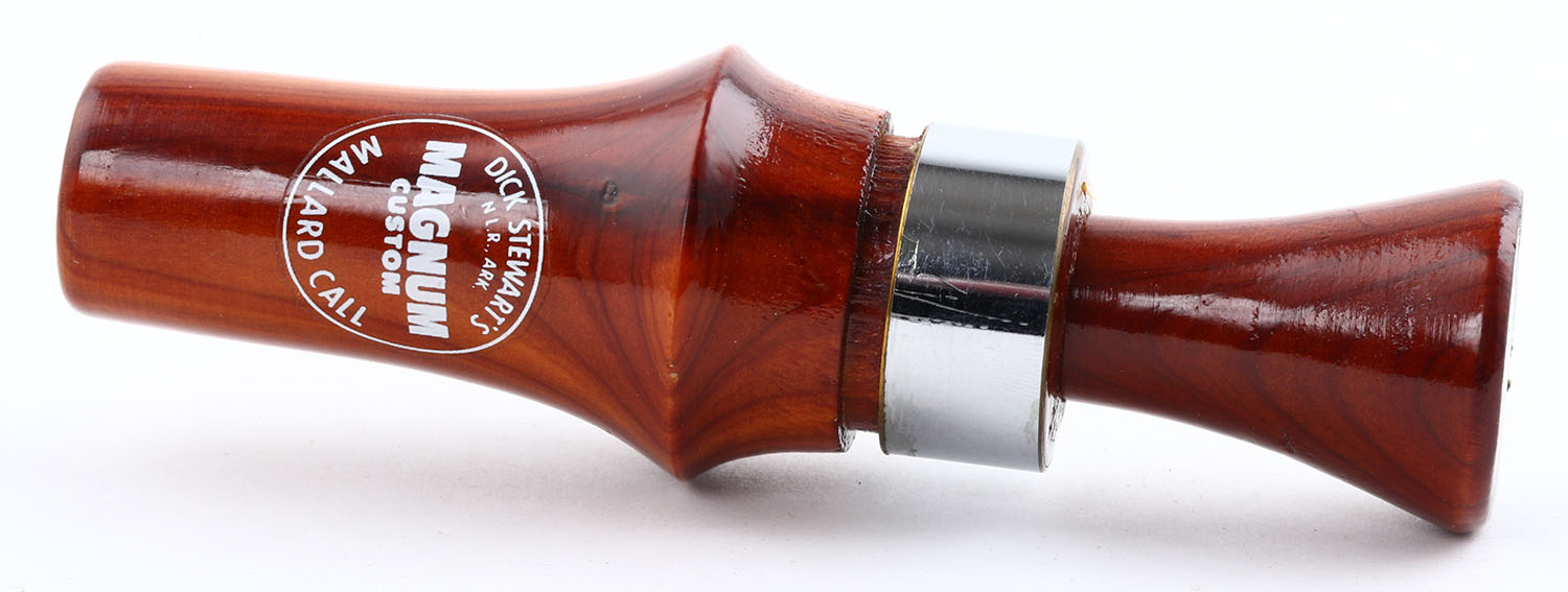 Dick Stewart, Magnum Custom Mallard Duck Call, North Little Rock, AR, 1928-2017, marked on sticker on barrel, plastic reed, 5 1/2'' OAL, nice finish. Grade: Excellent - Value: 80 to 160