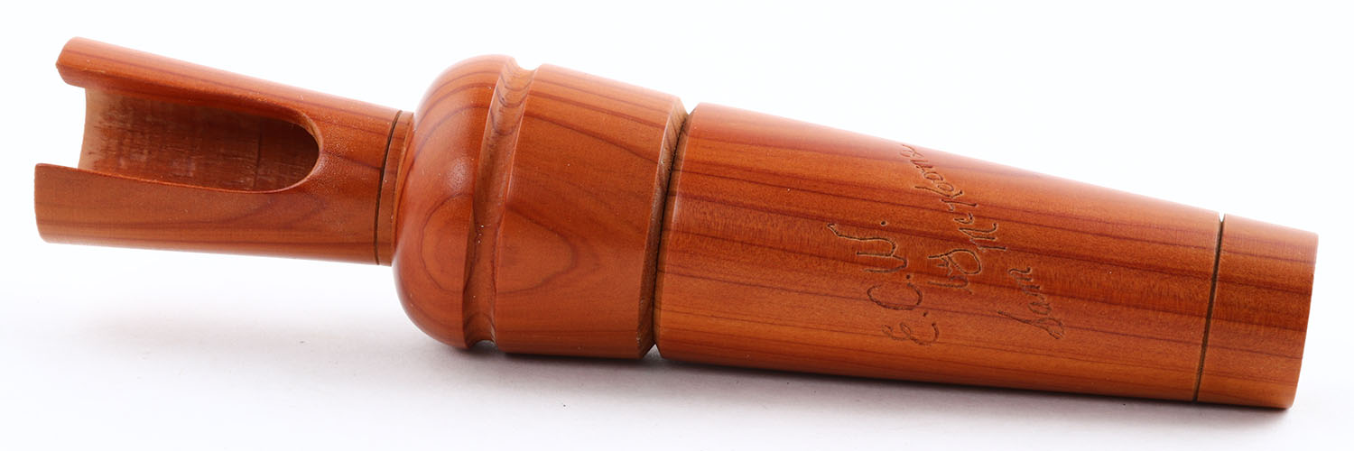 Sam McKoone Duck Call, Timmonsville, SC, marked ''ECW BY SAM McKOONE'' on barrel, plastic reed, unusual mouth piece, 7'' OAL, nice finish. Grade: Excellent - Value: 140 to 250