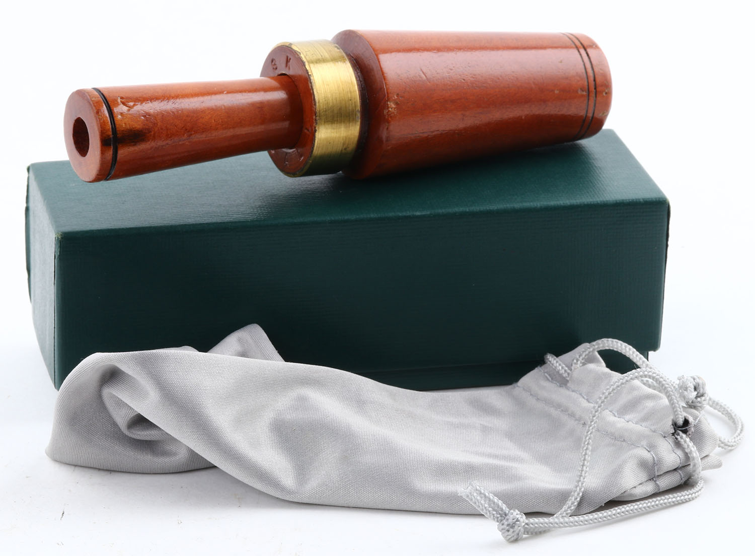 Hagan Carl ''Sonny'' Kirkpatrick Duck Call, Haynesville, LA, 1937-2012, marked on barrel rim ''S K'' over ''CALL'', signed ''TO CHRIS PEPA 92''', plastic reed, 5'' OAL, nice finish, some teeth marks & light wear, comes with box & microfiber pouch. Grade: Excellent - Value: 160 to 250