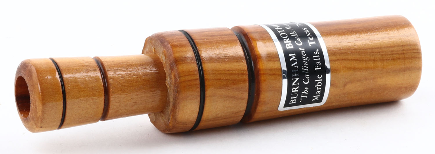 Burnham Brothers Goose Call, Marble Falls, TX, marked with sticker on barrel, plastic reed, 5'' OAL, nice finish. Grade: Excellent - Value: 10 to 50
