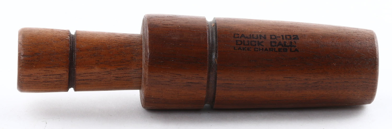 Cajun D-102 Duck Call, Lake Charles, LA, stamped on barrel, plastic reed, 4 1/2'' OAL, nice finish, has a couple handling marks. Grade: Excellent - Value: 10 to 40