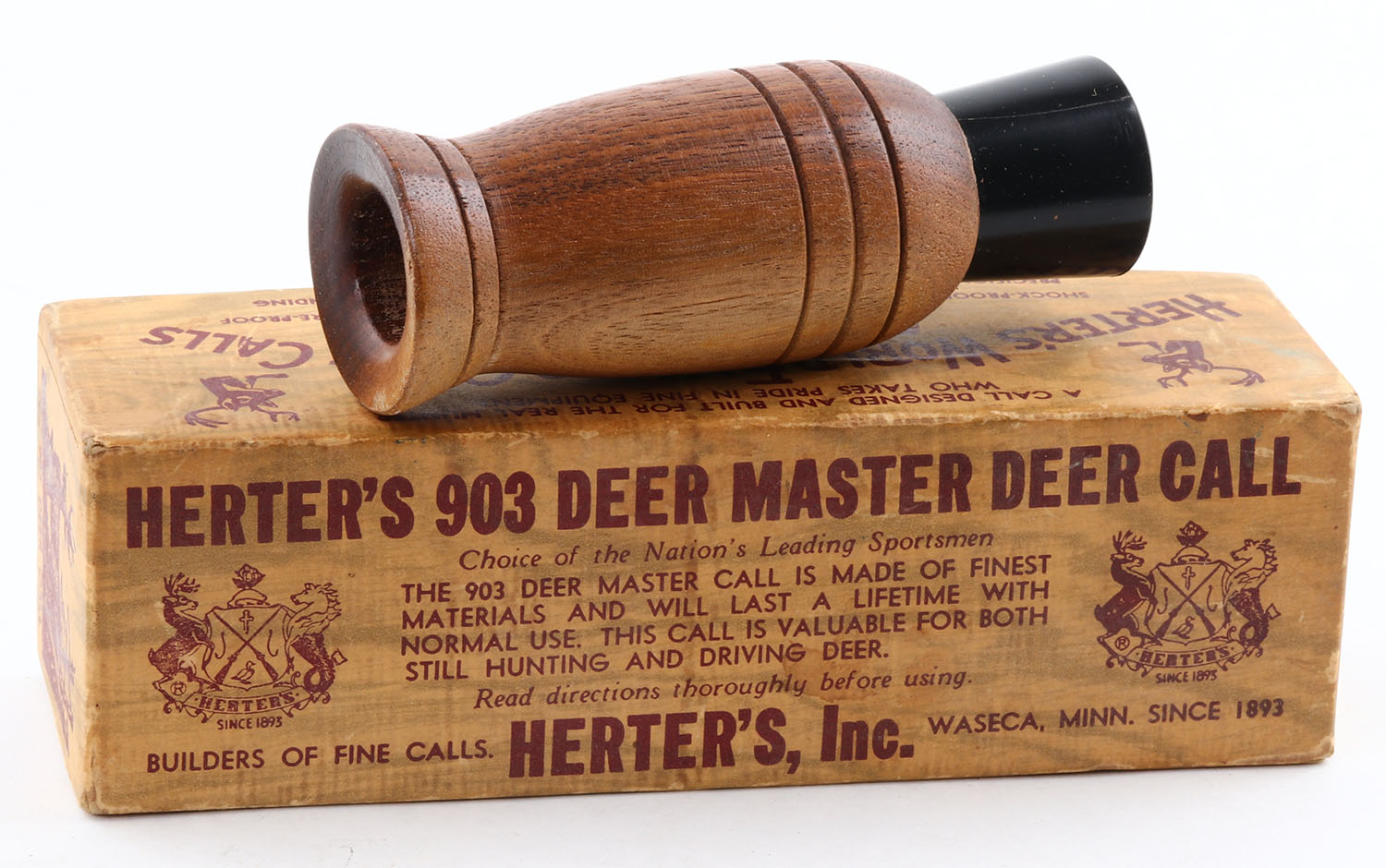 BOXED, Herter's 903 Deer Master Deer Call, marked on mouth piece, 4 1/2'', metal reed, finish is excellent. Grade: Excellent - Value: 10 to 50