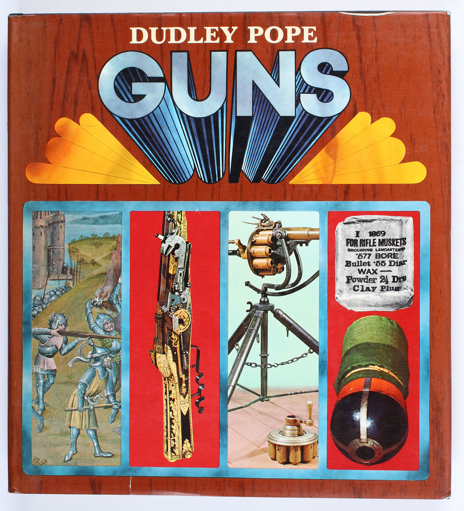 Guns by Dudley Pope 1969, 11'' x 12''. 254 pages, pages clean, binding tight, hardcover and dustjacket very good, colored images. Value: $40 Grade: Very Good ++ - Value: 2 to 40