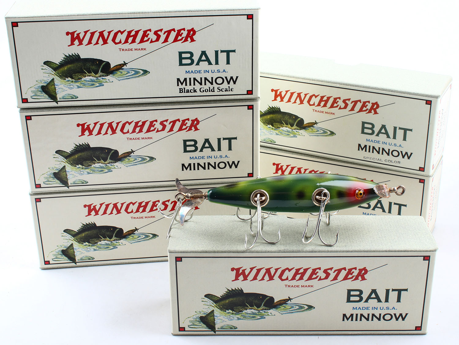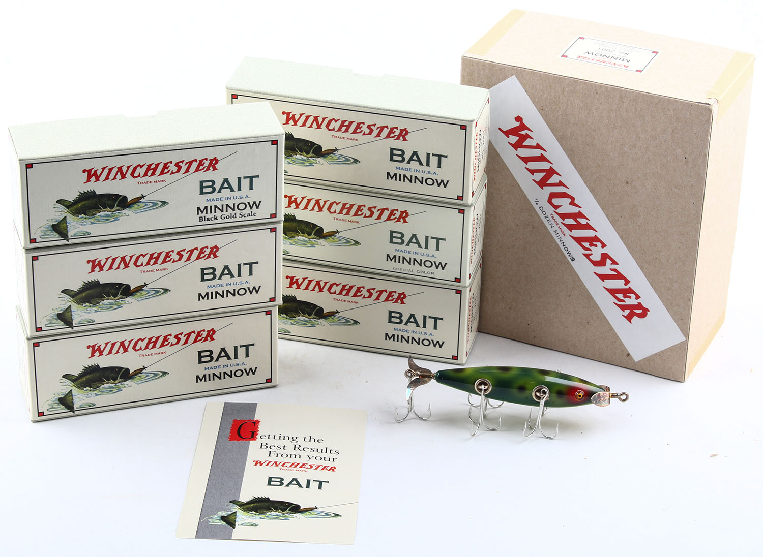 Full Case of (2001) Winchester lures, has 5 marked 2001 lures, they are all frog pattern & 5 hook lures. 1 box marked (2003). Grade: MINT - Value: 200 to 400