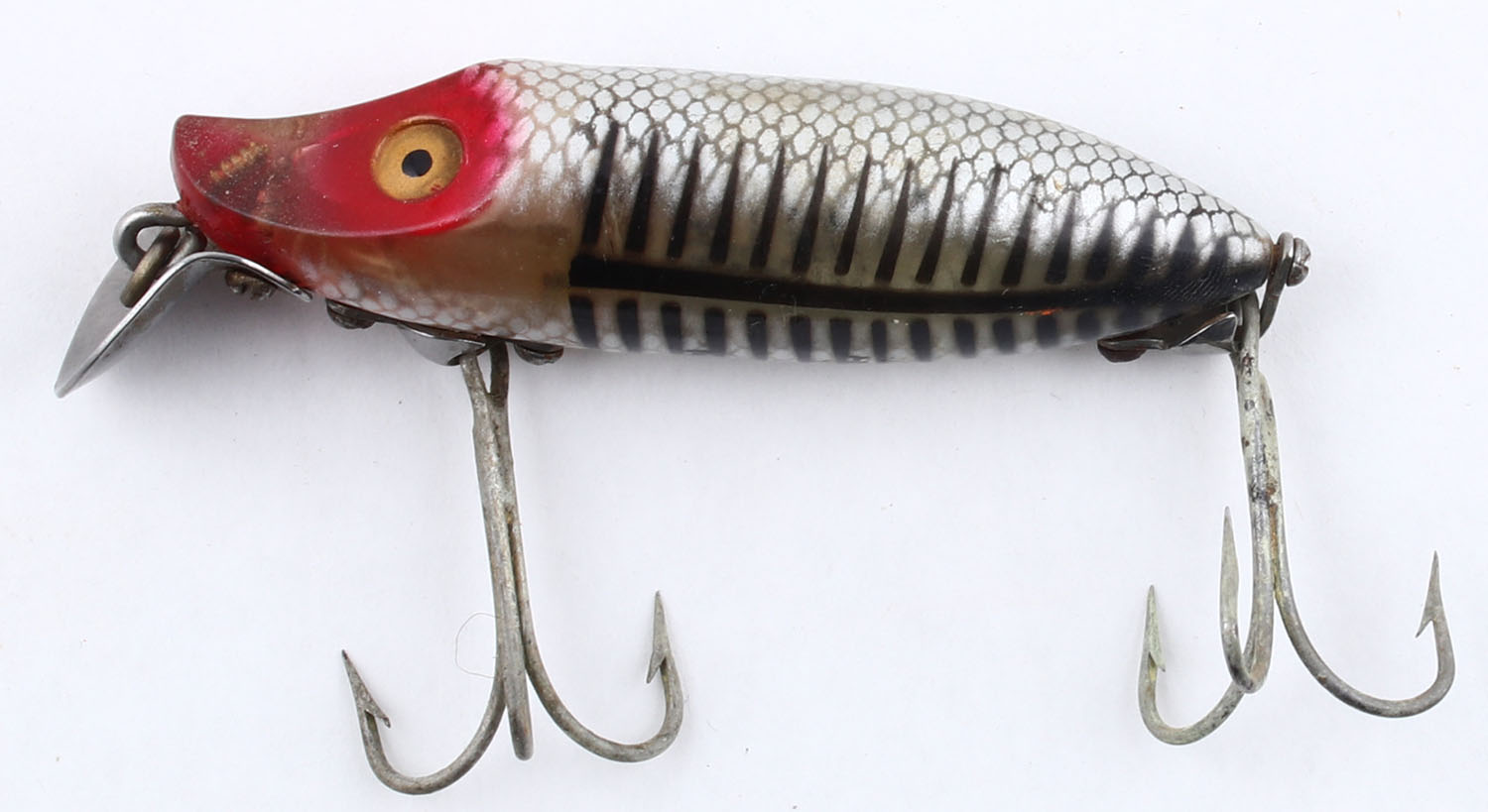 Heddon River Runt Spook Floater, plastic lure, PE, red head, silver scales & black stripes, surface rig, 2 hooks, fixed front blade, marked on belly, 3'' OAL. Grade: Excellent - Value: 10 to 50