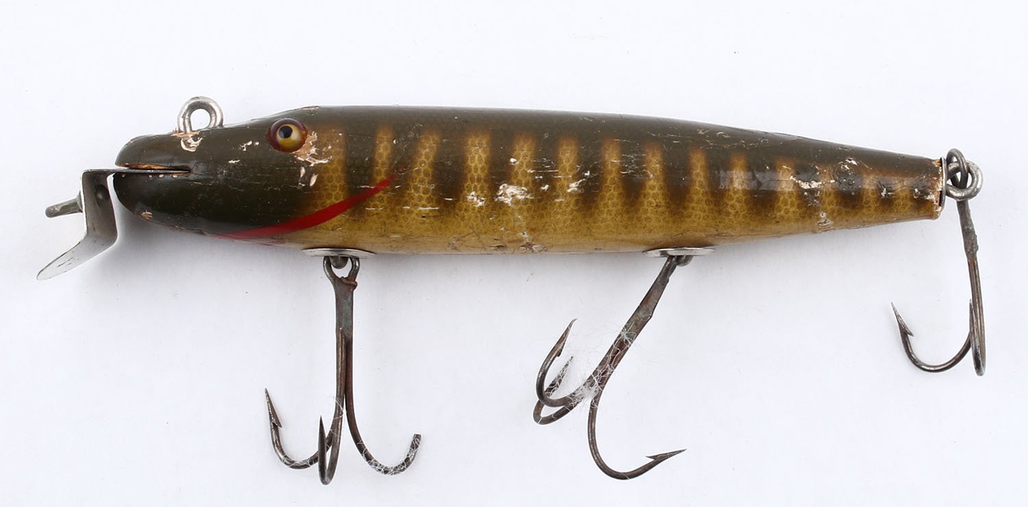 Creek Chub?, wood lure, GE, green, cream & red with scales, unmarked, 3 hooks, front blade, 4 1/2'' OAL. Grade: Good ++ - Value: 10 to 50