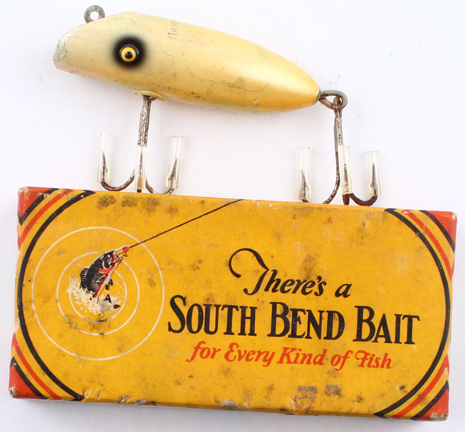 BOXED, South Bend Babe-Oreno, wood lure, TE, pearl color, marked on top, 2 hooks, 3'' OAL, box marked 972 PL, box has some age soiling. Grade: Very Good + - Value: 20 to 60