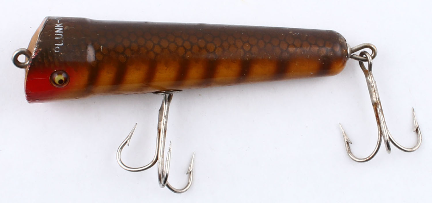 South Bend Plunk Oreno, wood lure, GE, brown, red & butterscotch, with scales & stripes, marked on top, 2 hooks, 4'' OAL. Grade: Very Good + - Value: 10 to 50
