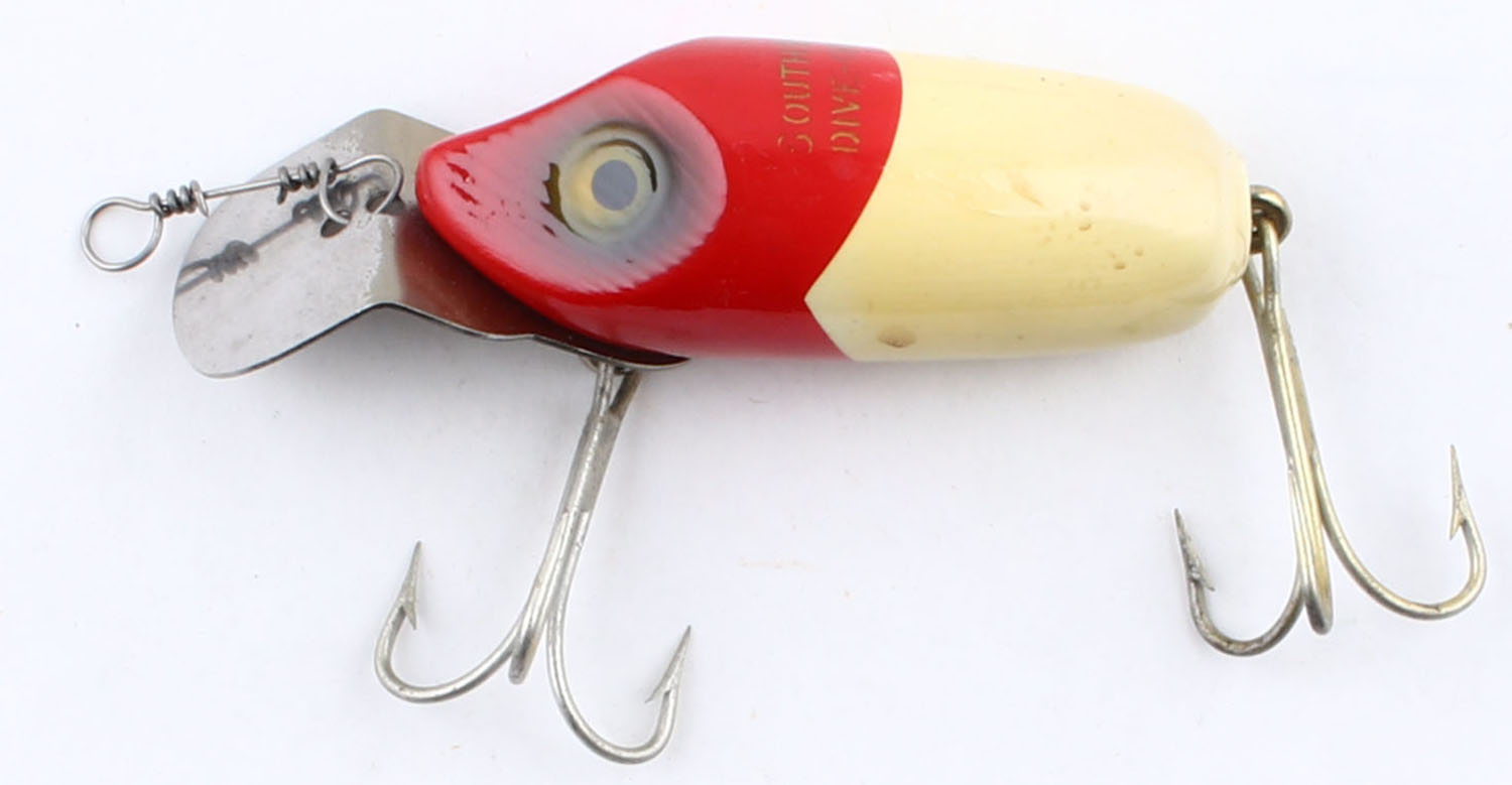 | South Bend Dive-Oreno, wood lure, PE, red & white, marked on to...